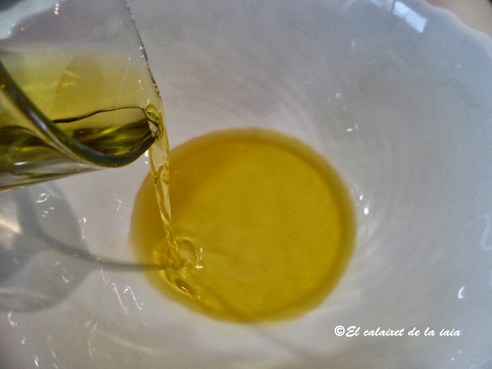 Pondremos en un bol que hemos calentado bajo el agua del grifo y secado el aceite tibio, no muy caliente que si no conseguiremos el efecto contrario, solo ha de estar TIBIO