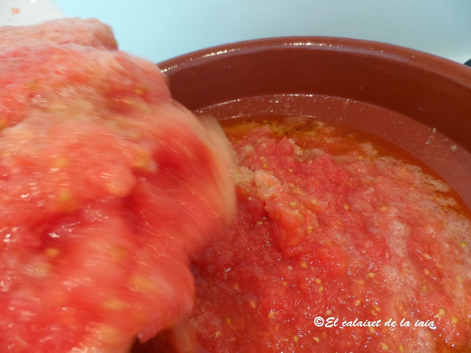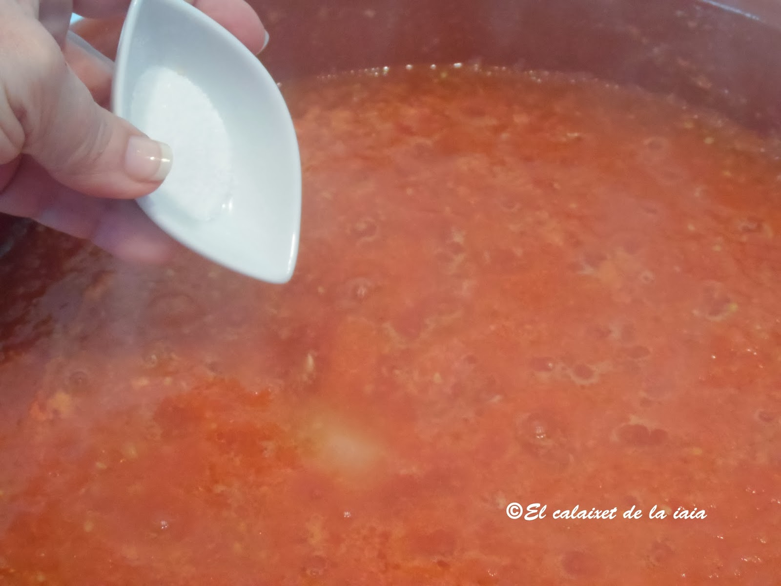 y el azúcar. Os tengo que confesar que al tomate no le pongo nunca ni sal, ni azúcar, pero la receta de mi iaia si llevaba, y os la pongo tal cual, aunque ella a veces, no ponía azúcar, sino media cucharadita rasa, de bicarbonato… Luego ya, que cada cual, (como os digo siempre) haga, según su gusto o preferencia.