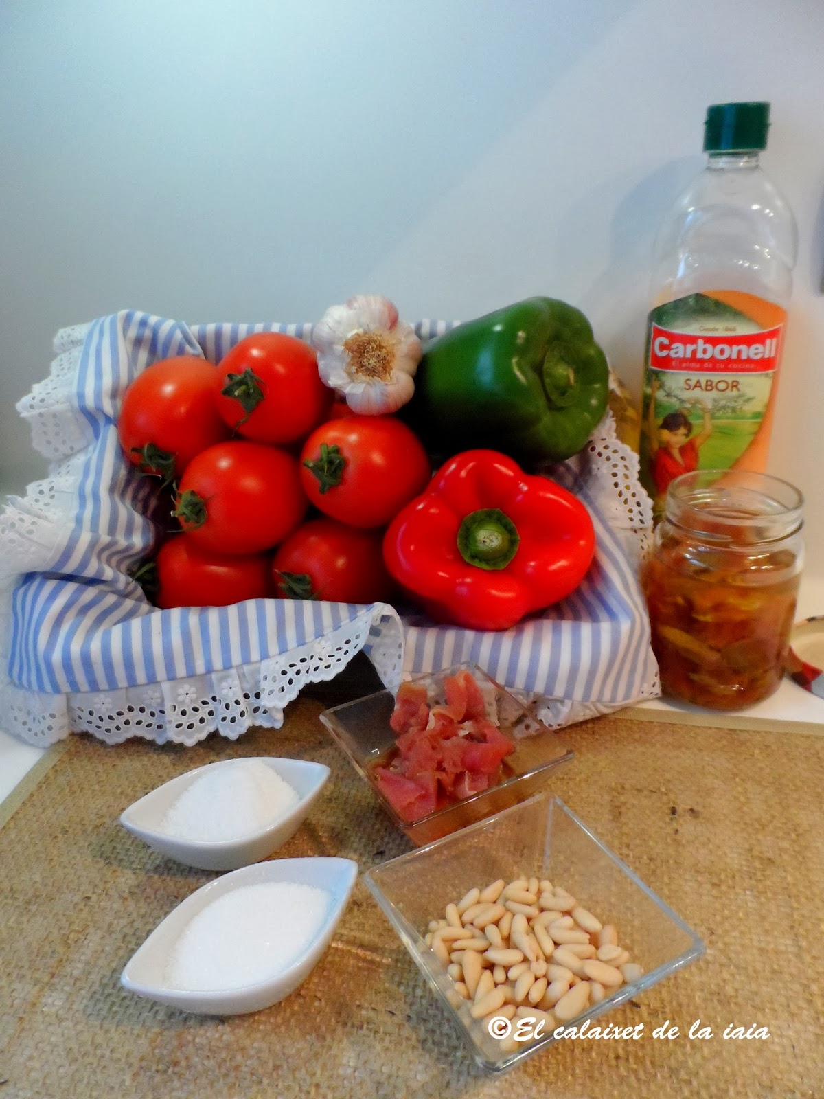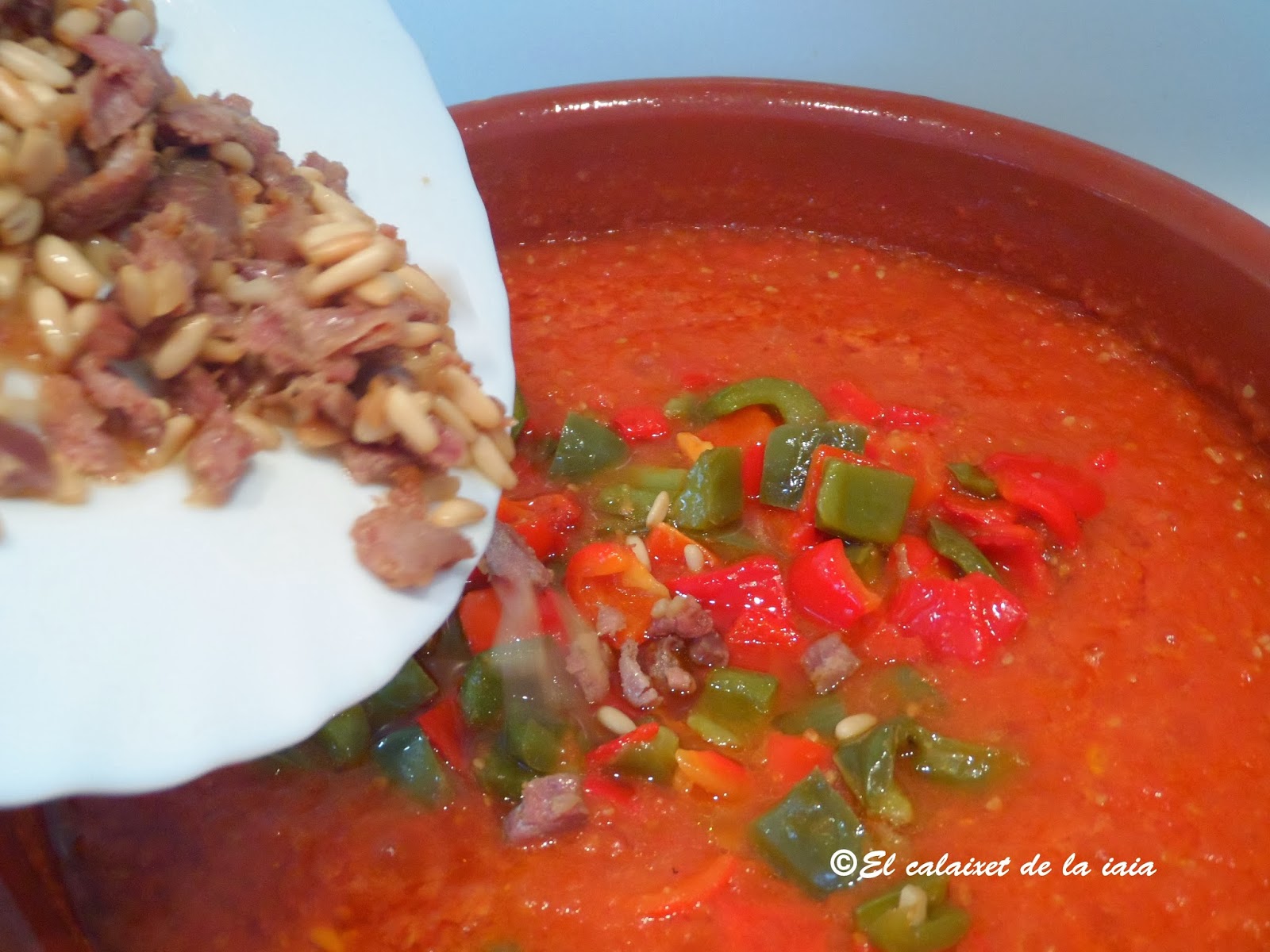 Si no la habéis probado nunca os animo a que la probéis, es una especie de pisto… pero a la valenciana, con un toque y sabor especial que le proporcionan los piñones dorados y la «tonyina de sorra», con una cocción lenta y sin prisas, para proporcionarle la melosidad necesaria. Y si ya la conocéis, seguro que os apetece recordar su especial sabor, al que añadiendo atún en aceite y huevos cocidos, podemos preparar unos pepitos, coca…