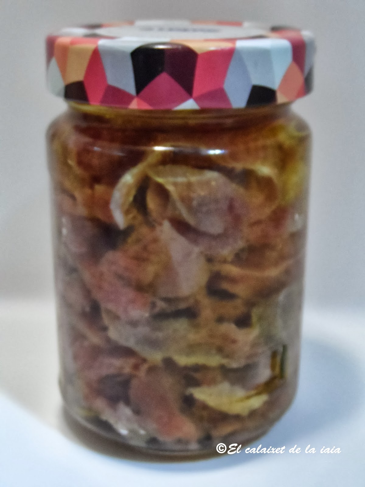 La troceo con los dedos, haciendo un tipo de «esgarraet», o sea desgarrándola, y la pongo en un tarro de cristal, cubierta por completo con aceite de oliva