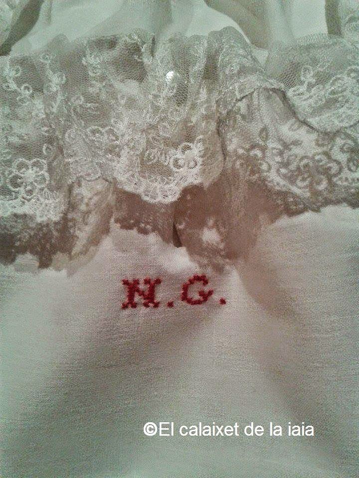 ésta vez la bordé en color crema, con punto de cadeneta y letra inglesa pero es mucho más tradicional bordarlas a punto de cruz también, y principalmente en rojo o azul