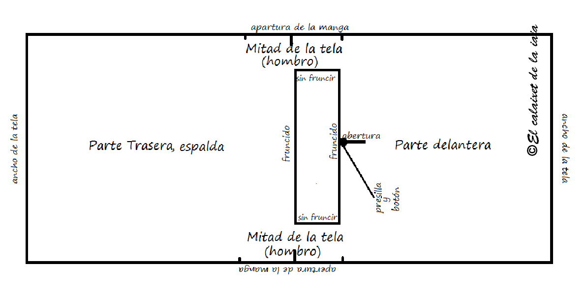 Esto sería «l’arbre».Las medidas son 80 cm de ancho x 180 de largo (teniendo en cuenta que nos comeremos dos centimetros de ancho y otros dos de largo para las orillas) que doblaremos por la mitad y nos dará un largo total de 90 cm. yo soy pequeña y llenita, bueno, siendo completamente sincera, muuuy pasada de kilos ya, jajaja y me llega la camisa por las rodillas que es el largo aproximado. Calculad según vuestras medidas. La camisa no lleva costura alguna en los hombros,es toda una pieza.