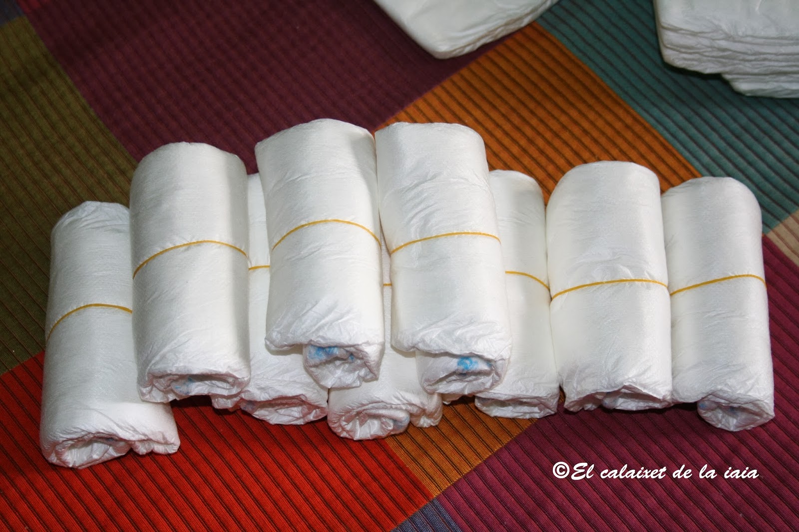 una vez la primera bandeja llena, colocamos la siguiente para ver que no sobresale ningún pañal