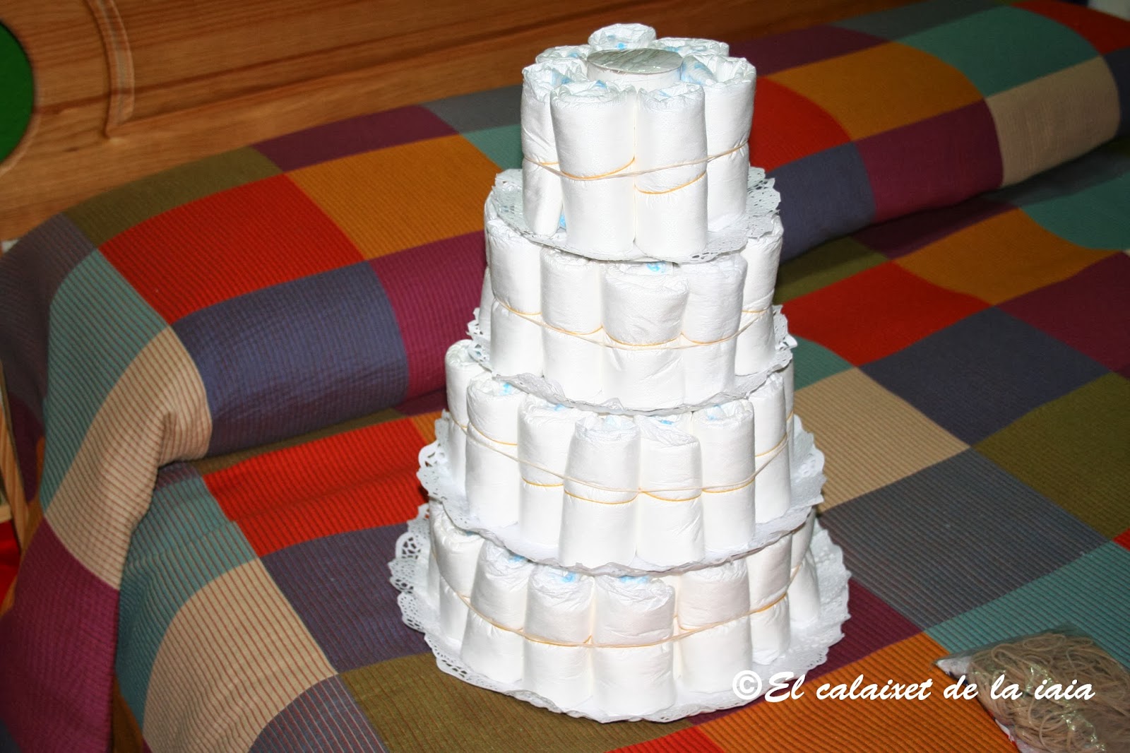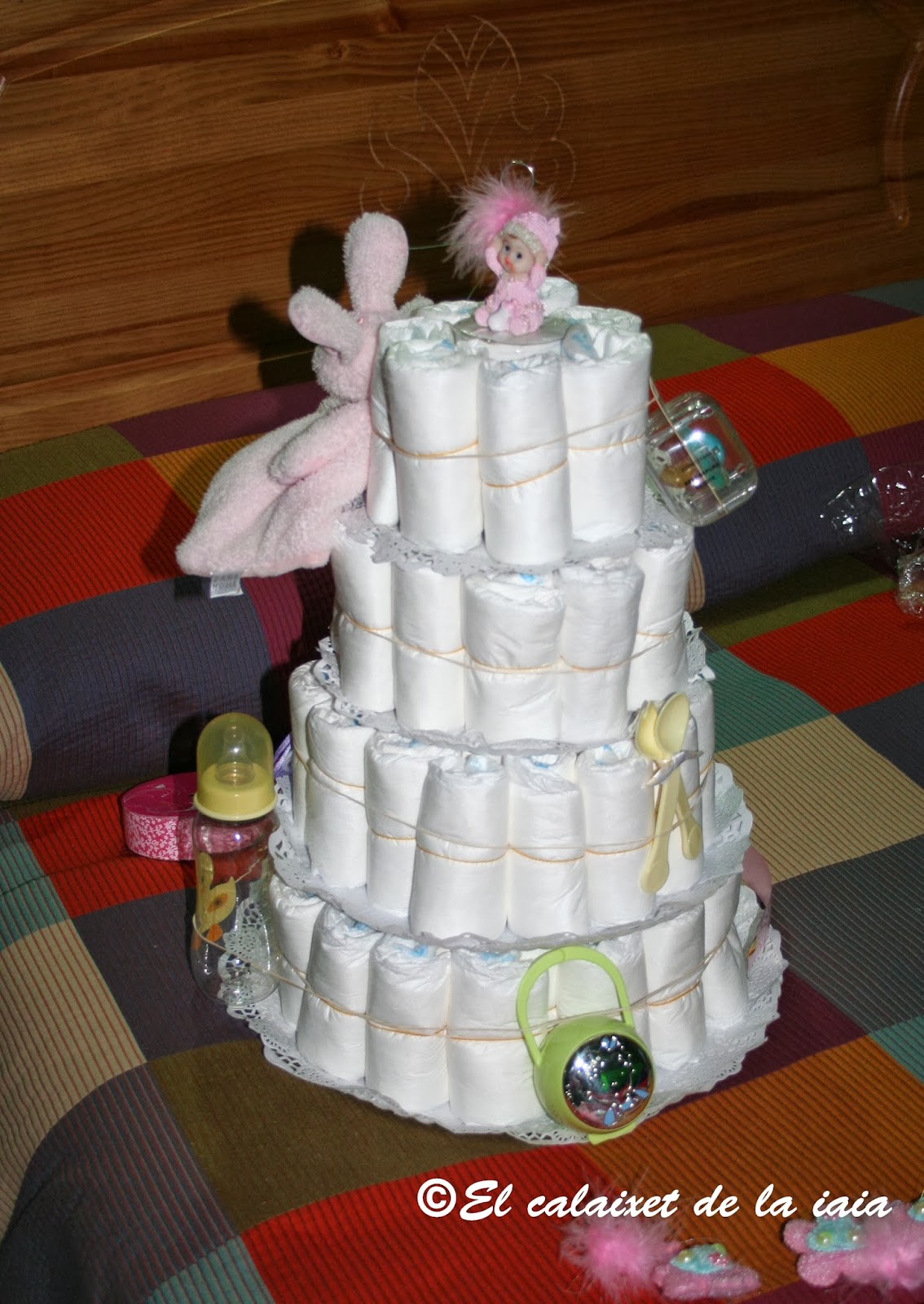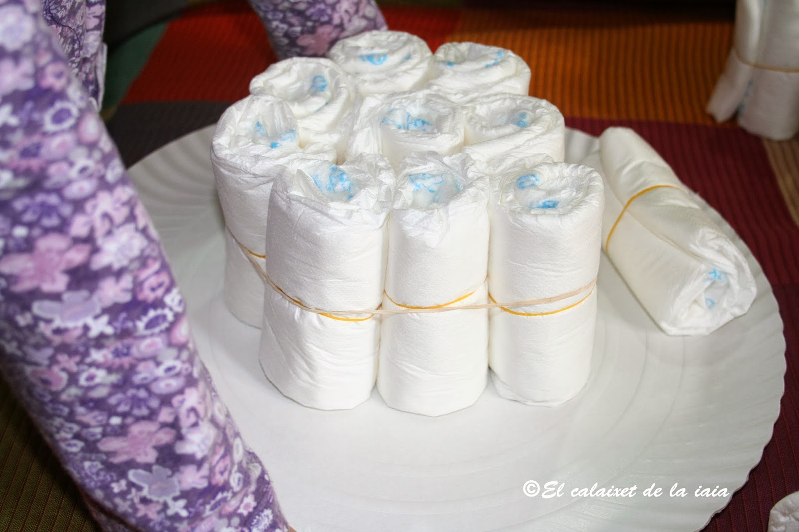 La que preparamos tenía 124 pañales 53 de la talla recién nacido y 72 de la talla de 3 a 6 k. Otras veces las he hecho de solo dos pisos, ésta vez es la mas grande que he preparado.
