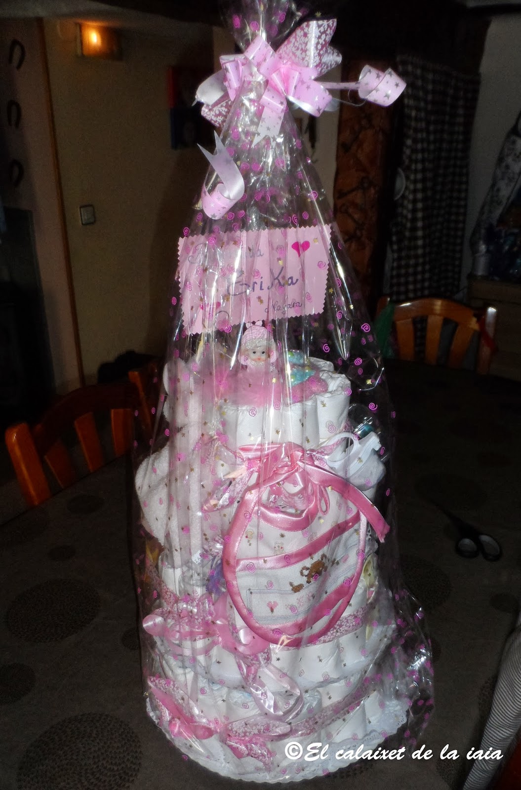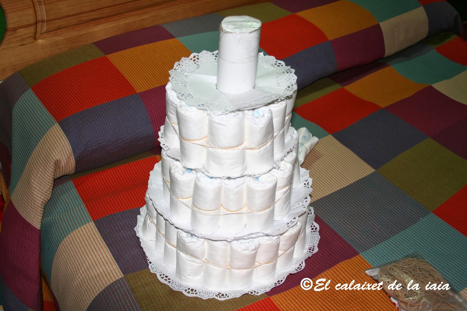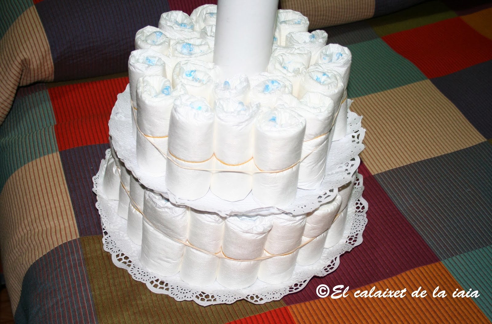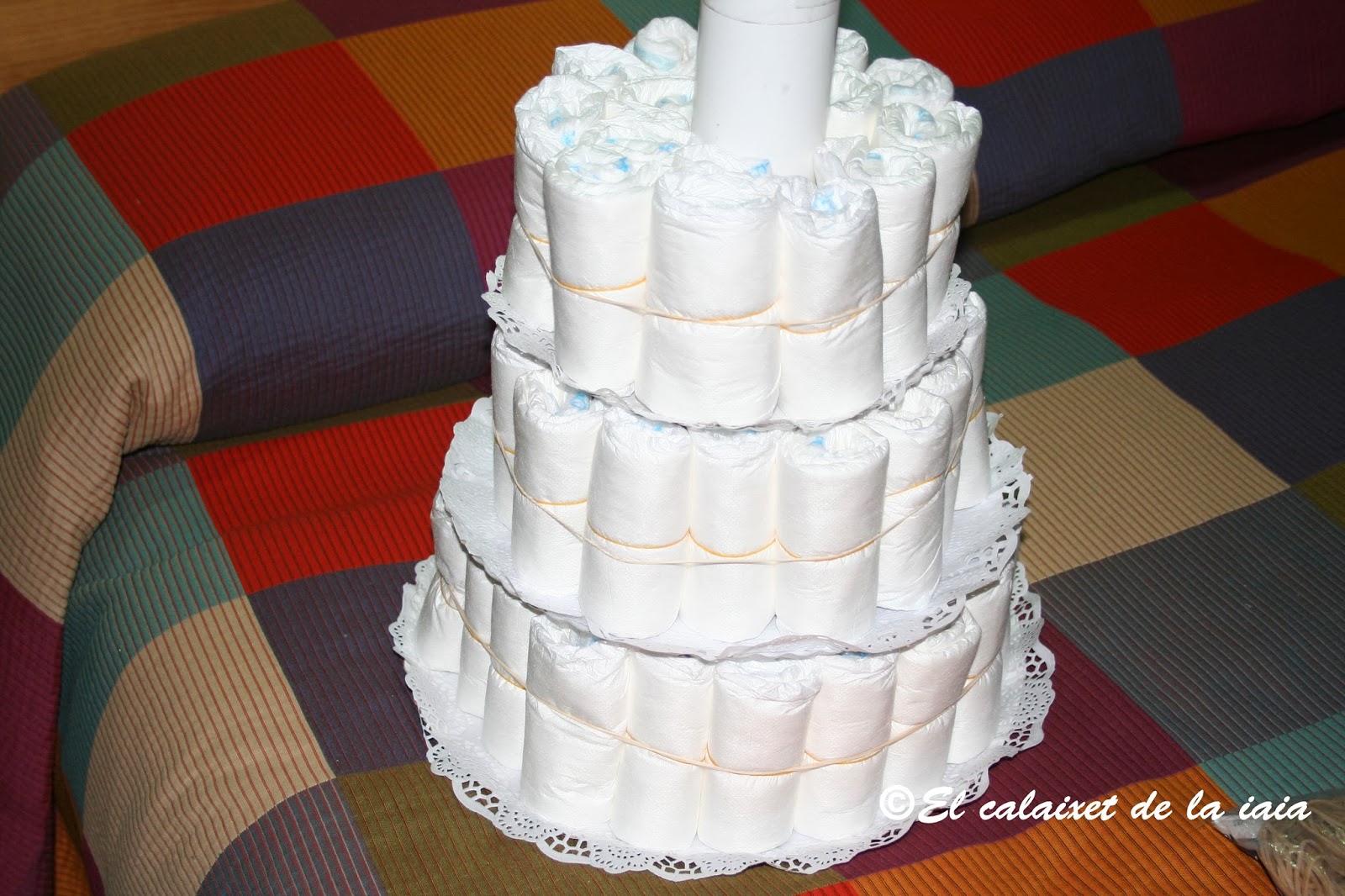 La que preparamos tenía 124 pañales 53 de la talla recién nacido y 72 de la talla de 3 a 6 k. Otras veces las he hecho de solo dos pisos, ésta vez es la mas grande que he preparado.