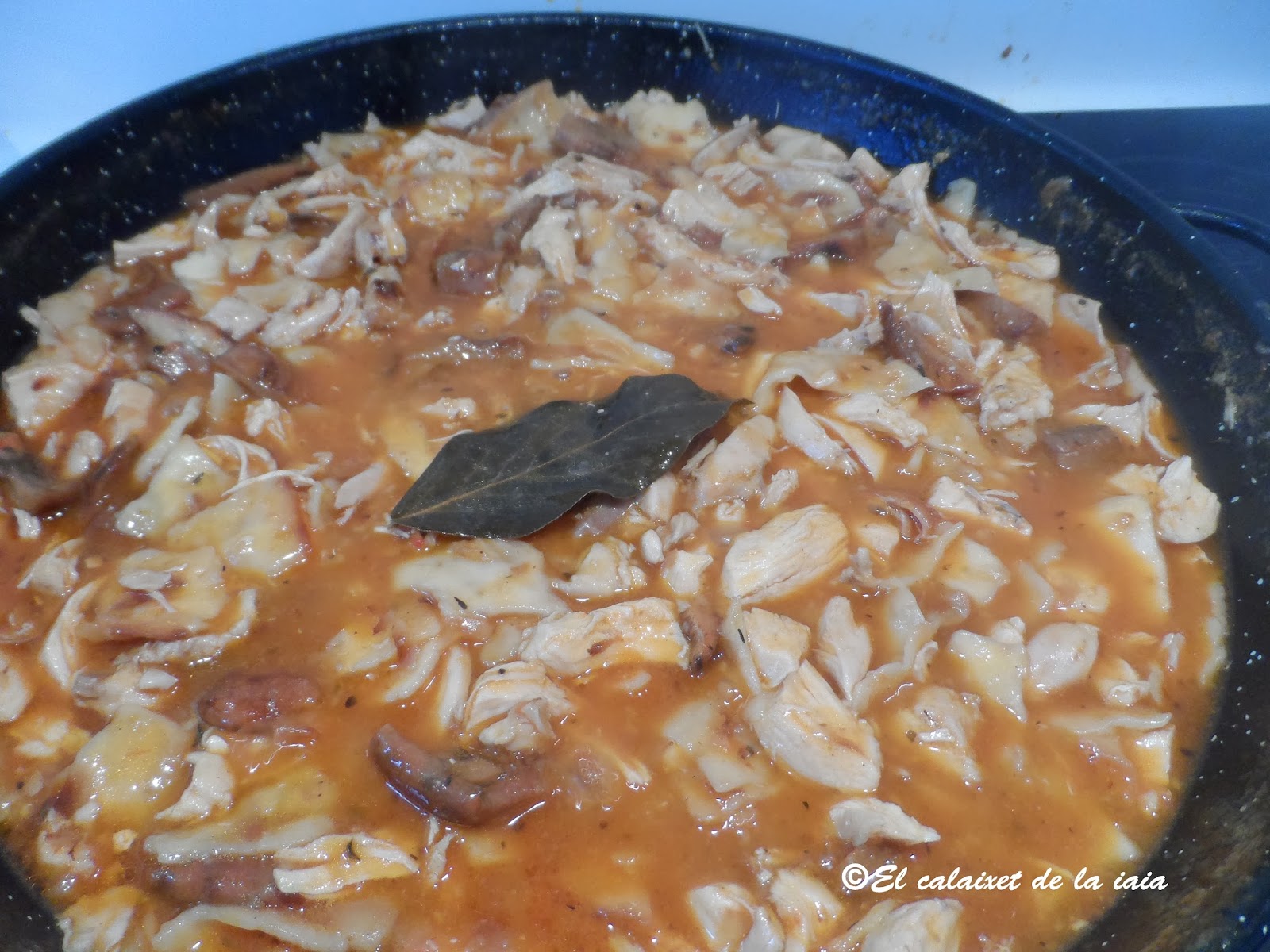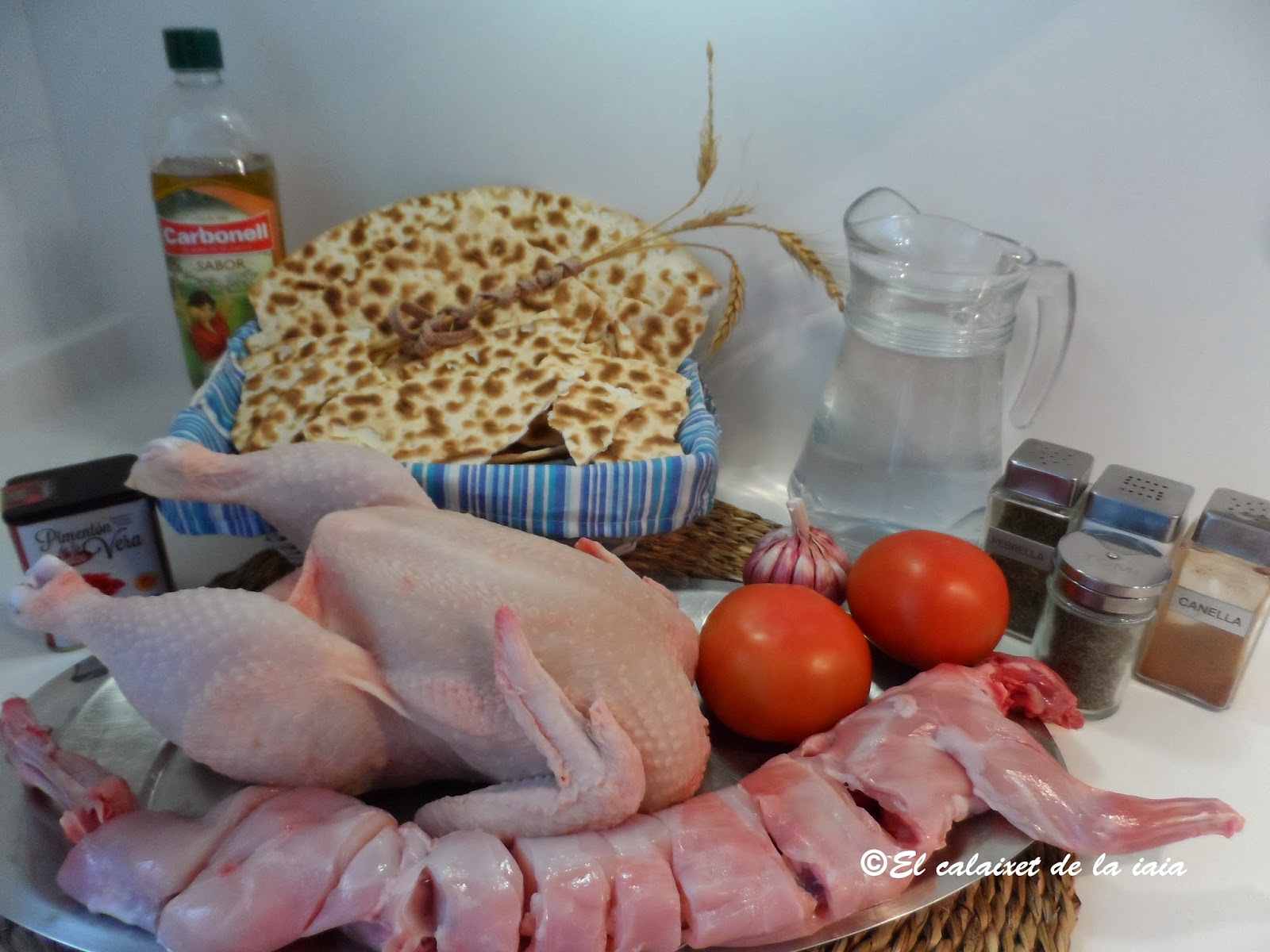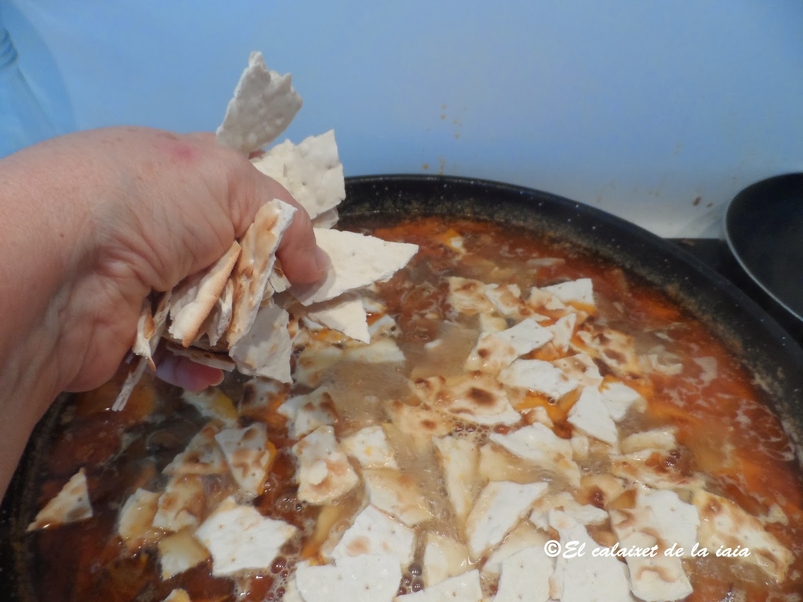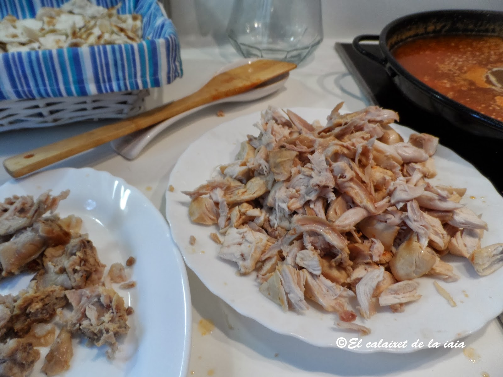 Sacamos el pollo y el conejo de la paella, una vez cocidos y lo deshuesamos y desmenuzamos. Los gaspachos así, resultan mas fáciles de comer y a mi particularmente me gustan mucho mas que con los trozos de carne, en casa, siempre los preparo así, como los hacía la madre de mi amiga y vecina Loli en Sinarcas, aunque su madre, hace las sollapas al momento y sobre las cenizas y brasas de la llar, y los gaspachos en el monte, y con leña, como hago yo en el pueblo… madre míaaaa eso si que esta de muerte, nada que ver con estas hechas en mi horno, ni los gaspachos en una vitro pero… «aixina matèm el cuc» así matamos el gusano, o sea, las ganas de comer gaspachos ¿no?