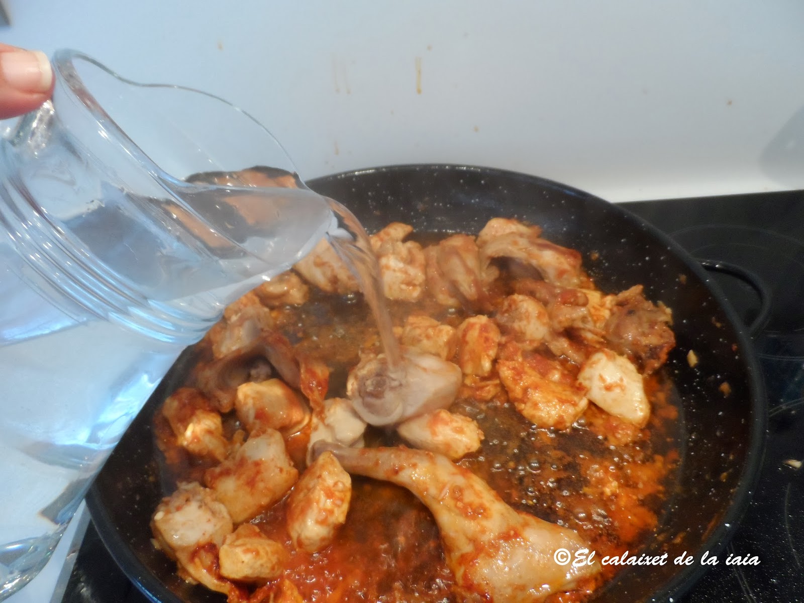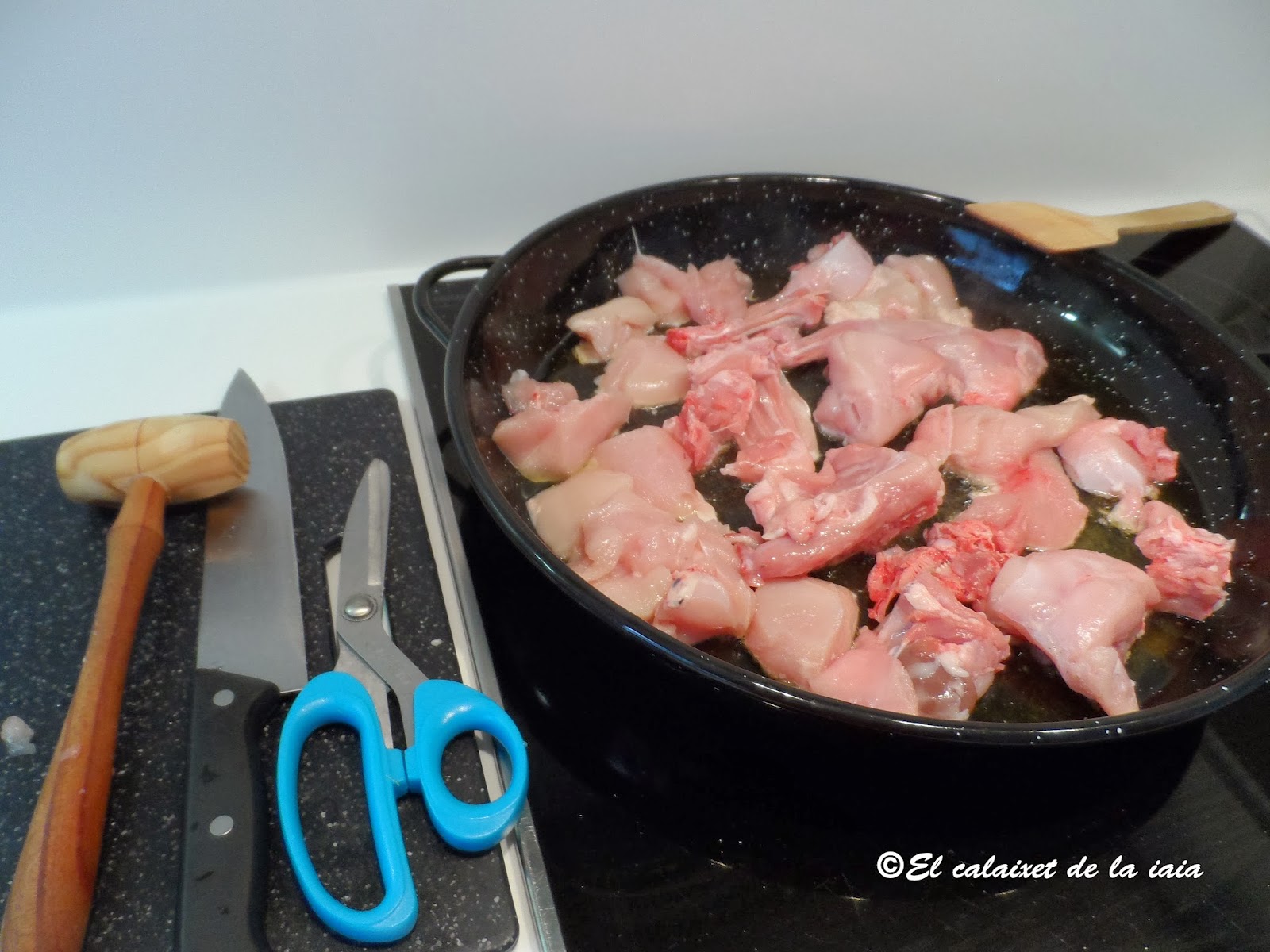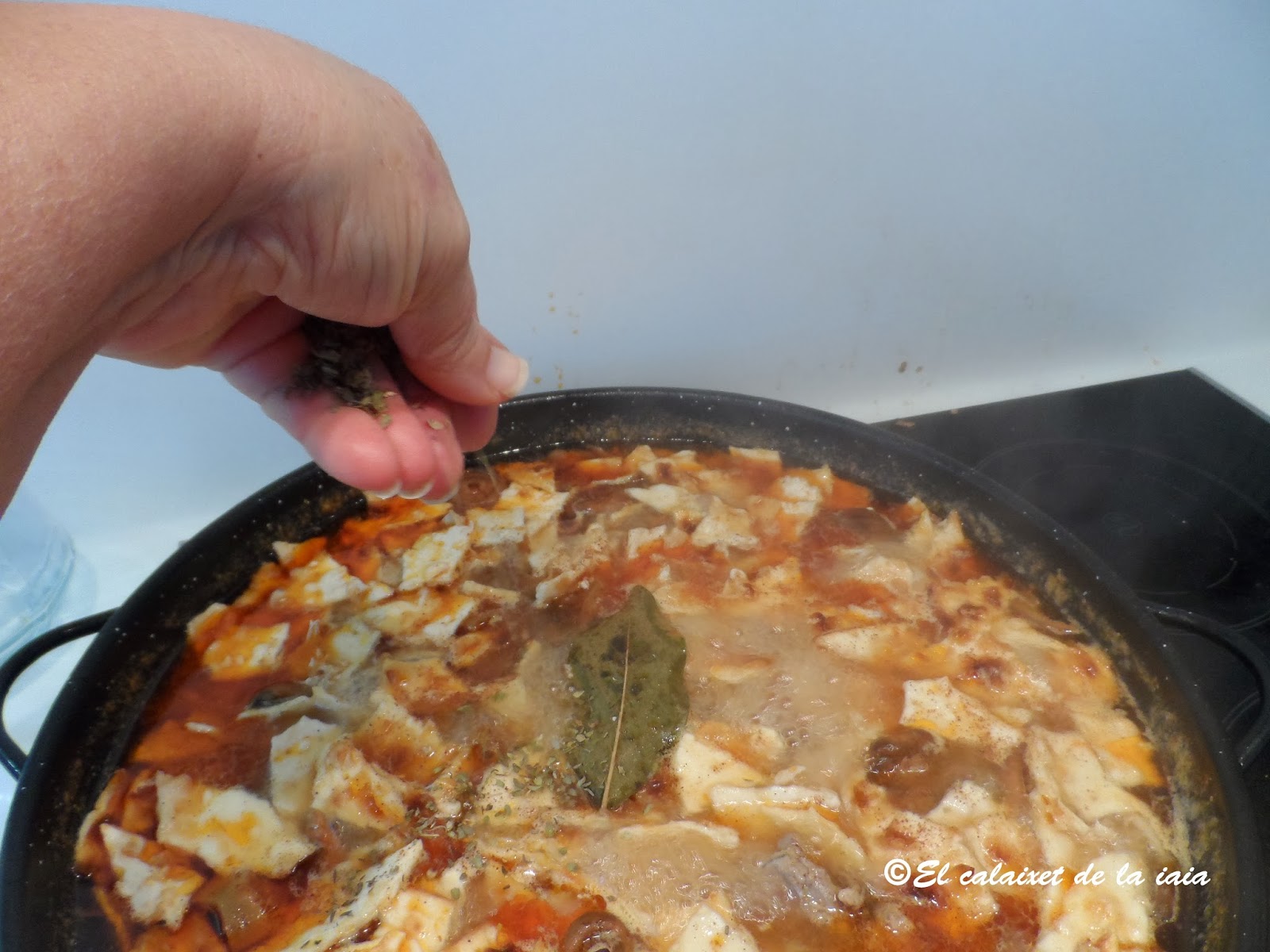 Sacamos el pollo y el conejo de la paella, una vez cocidos y lo deshuesamos y desmenuzamos. Los gaspachos así, resultan mas fáciles de comer y a mi particularmente me gustan mucho mas que con los trozos de carne, en casa, siempre los preparo así, como los hacía la madre de mi amiga y vecina Loli en Sinarcas, aunque su madre, hace las sollapas al momento y sobre las cenizas y brasas de la llar, y los gaspachos en el monte, y con leña, como hago yo en el pueblo… madre míaaaa eso si que esta de muerte, nada que ver con estas hechas en mi horno, ni los gaspachos en una vitro pero… «aixina matèm el cuc» así matamos el gusano, o sea, las ganas de comer gaspachos ¿no?