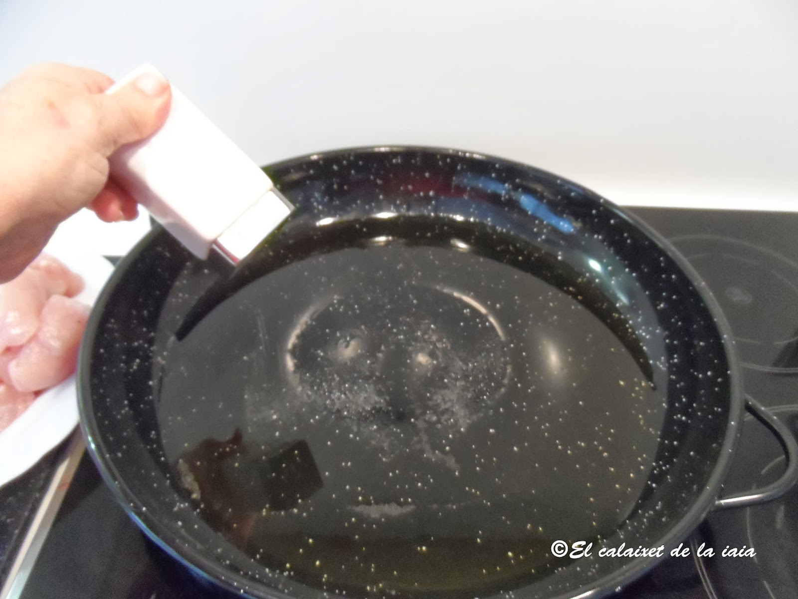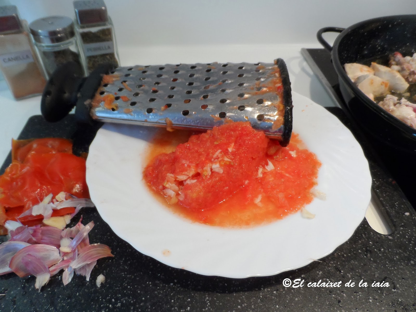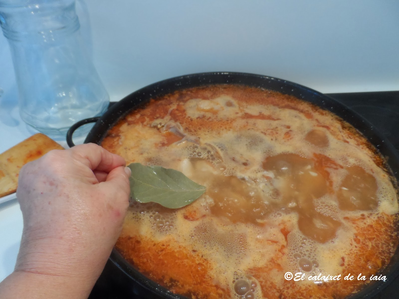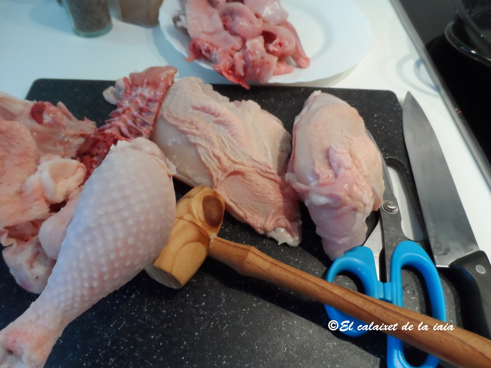 Sacamos el pollo y el conejo de la paella, una vez cocidos y lo deshuesamos y desmenuzamos. Los gaspachos así, resultan mas fáciles de comer y a mi particularmente me gustan mucho mas que con los trozos de carne, en casa, siempre los preparo así, como los hacía la madre de mi amiga y vecina Loli en Sinarcas, aunque su madre, hace las sollapas al momento y sobre las cenizas y brasas de la llar, y los gaspachos en el monte, y con leña, como hago yo en el pueblo… madre míaaaa eso si que esta de muerte, nada que ver con estas hechas en mi horno, ni los gaspachos en una vitro pero… «aixina matèm el cuc» así matamos el gusano, o sea, las ganas de comer gaspachos ¿no?