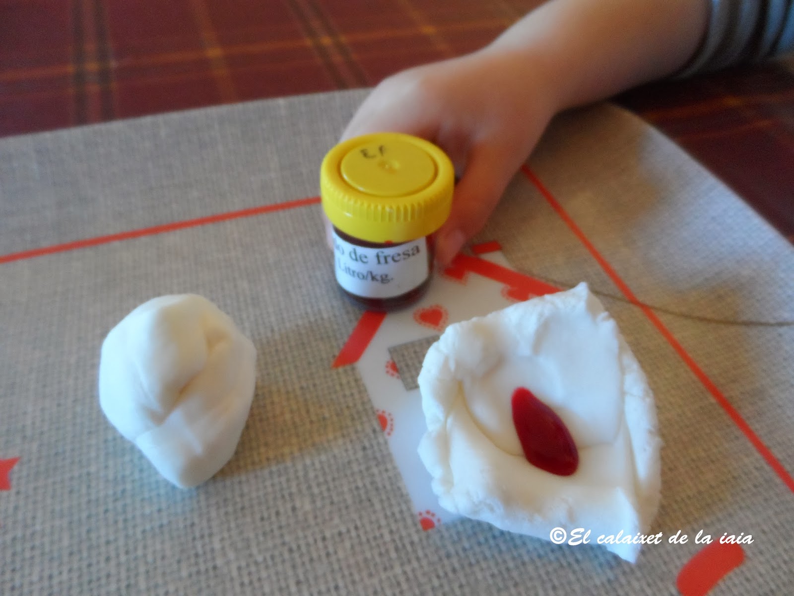 para ello separaremos dos porciones de fondant de y las trabajaremos haciendo dos bolas. En una de ellas añadiremos concentrado de fresa, para teñir de rosa