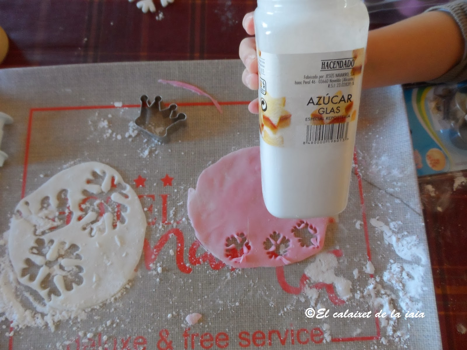 un truco para poder trabajar el fondant sin que se nos pegue en las manos o en los moldes es utilizar azúcar glas