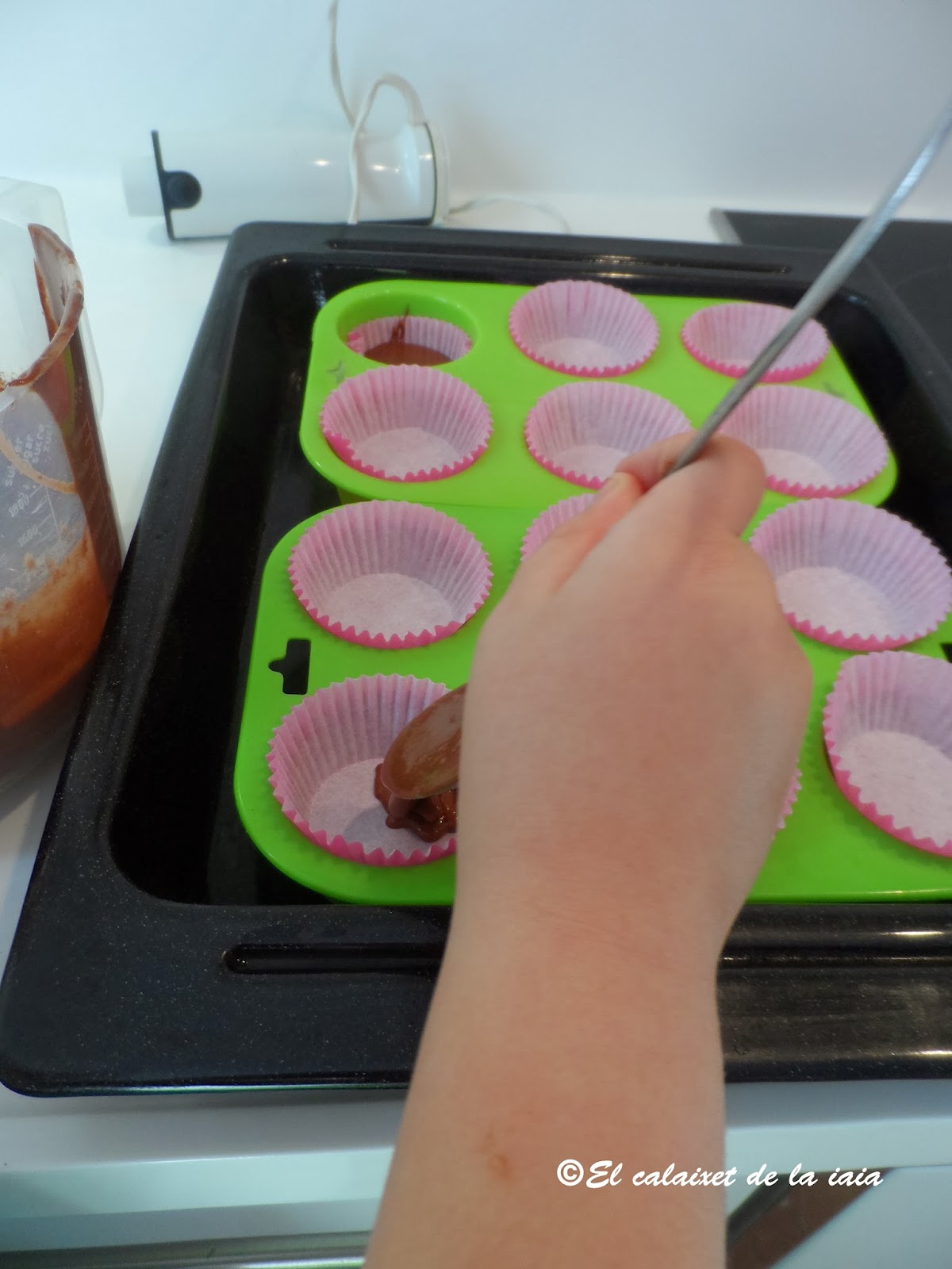 y como está a gusto de la cocinera, con una cuchara repartimos bien esta mezcla en los moldes, aproximadamente hasta la mitad porque luego subirá la mezcla cuando horneemos.