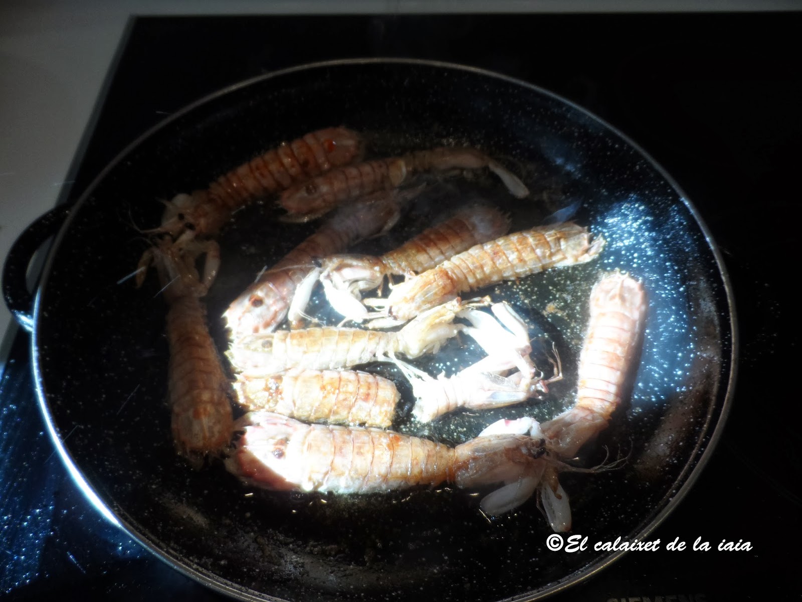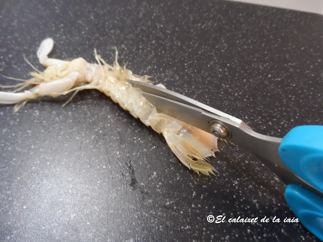 Sigo las enseñanzas de mi iaia Conxeta y abro las galeras con unas tijeras desde la punta de la cola, a la cabeza, de ésta manera llegaremos a su carne de manera fácil para degustarla. Quitaremos los bigotes y enjuagaremos