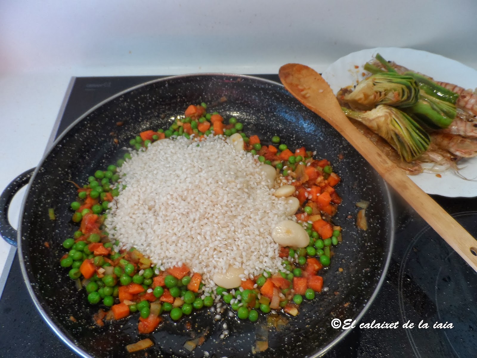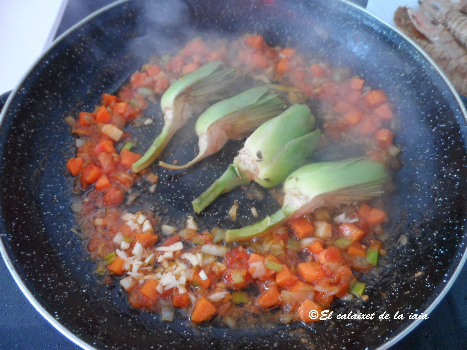 incorporamos las alcachofas y las galeras y dejamos a fuego medio unos 25, 28 minutos si es arroz bomba, si es redondo solo 20.
