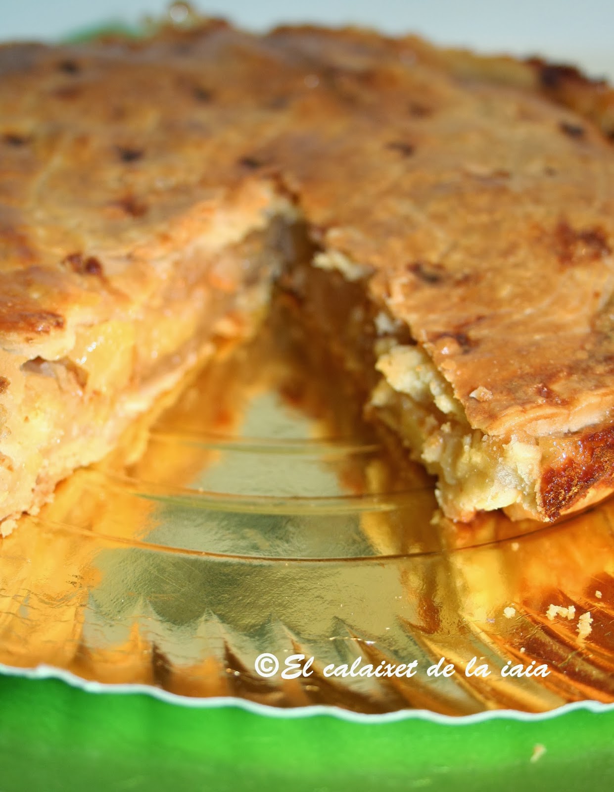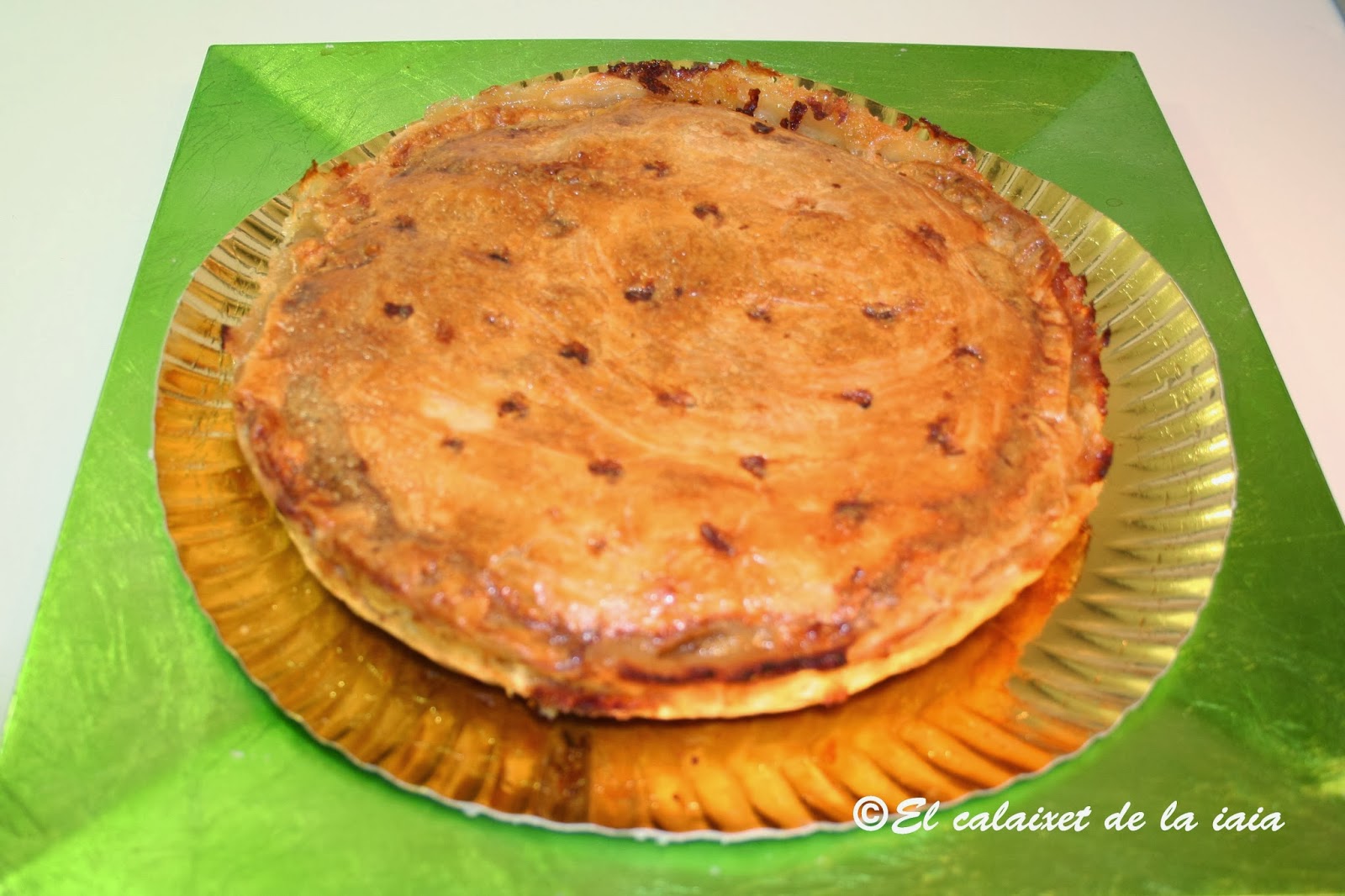 En un molde bajo para tarta, aplicamos papel sulfurizado (de hornear), y colocamos encima una de las planchas de masa, volcamos sobre ella la compota que hemos preparado y añadiremos la otra plancha de masa, sellaremos los bordes, realizamos unos agujeros para que hagan de chimeneas, pincelamos con huevo batido. Y al horno precalentado a 180º unos 25 minutos. Controlad el tiempo según vuestro horno, ya sabéis que cada horno funciobna de una manera y necesita unos tiempos distintos así que los que os doy, son sólo orientativos.