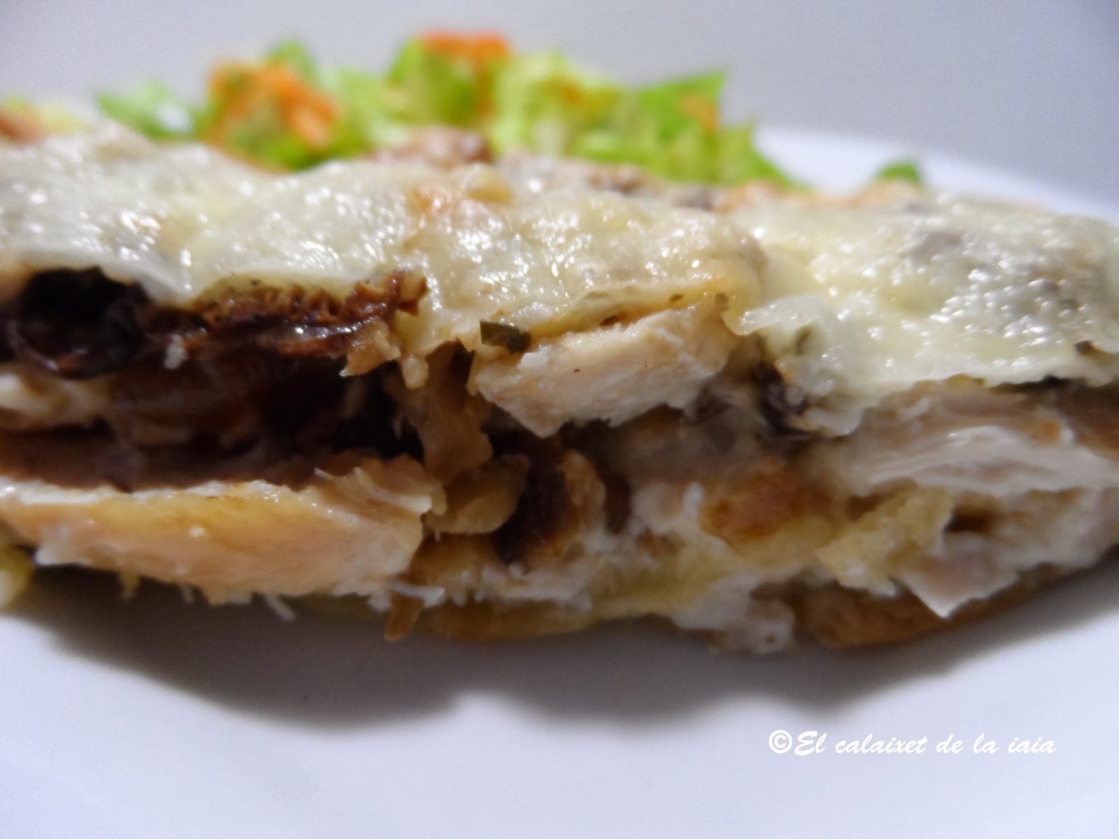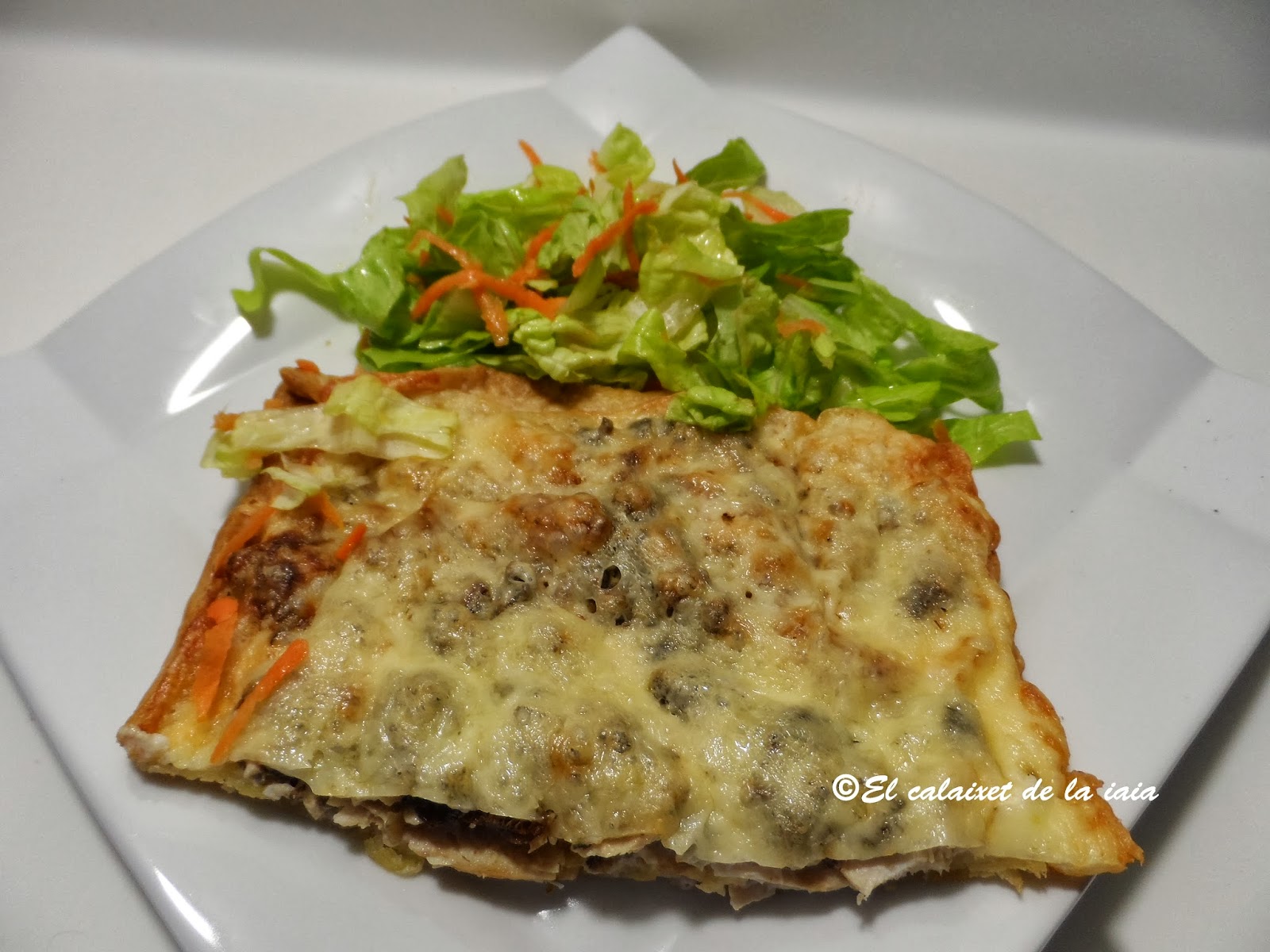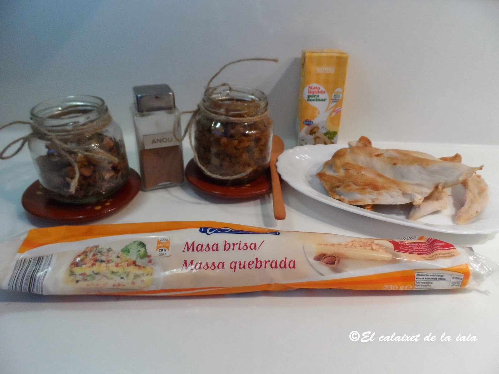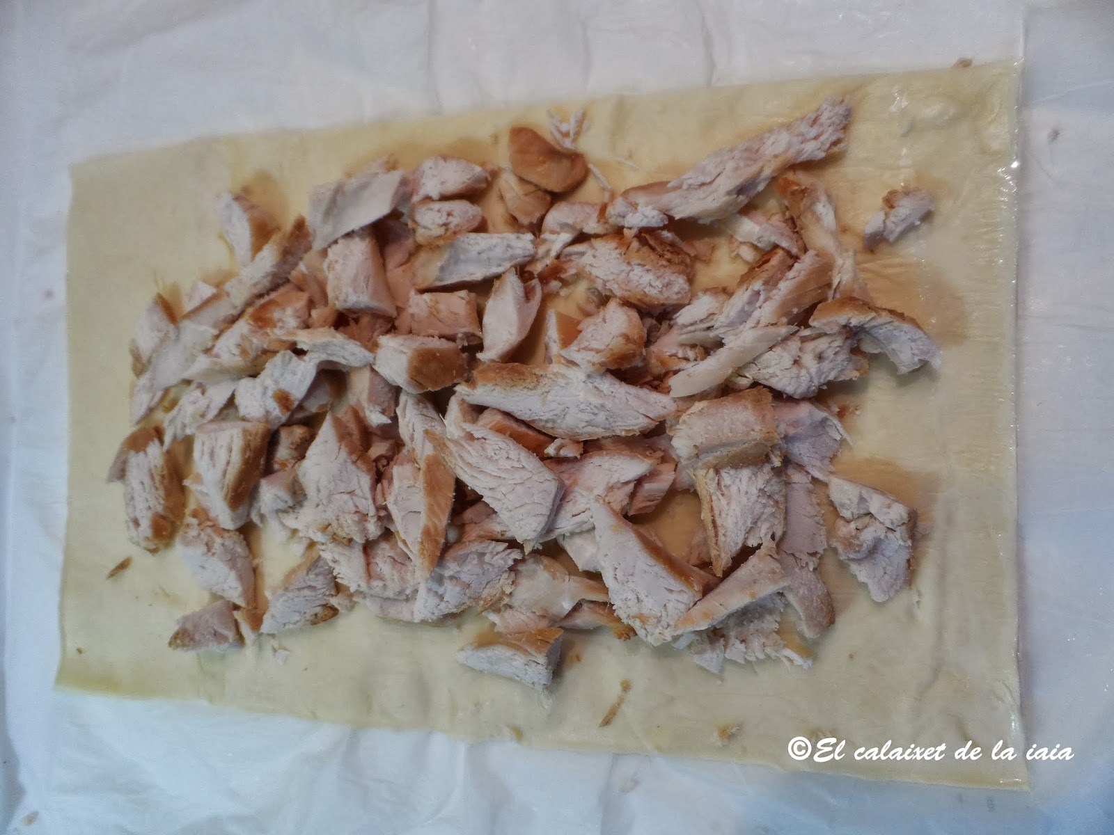 Hoy, cena de aprovechamiento. Abro la nevera y me encuentro con pechuga y media asada, la cebolla que caramelicé ésta mañana y una plancha de masa brisa.