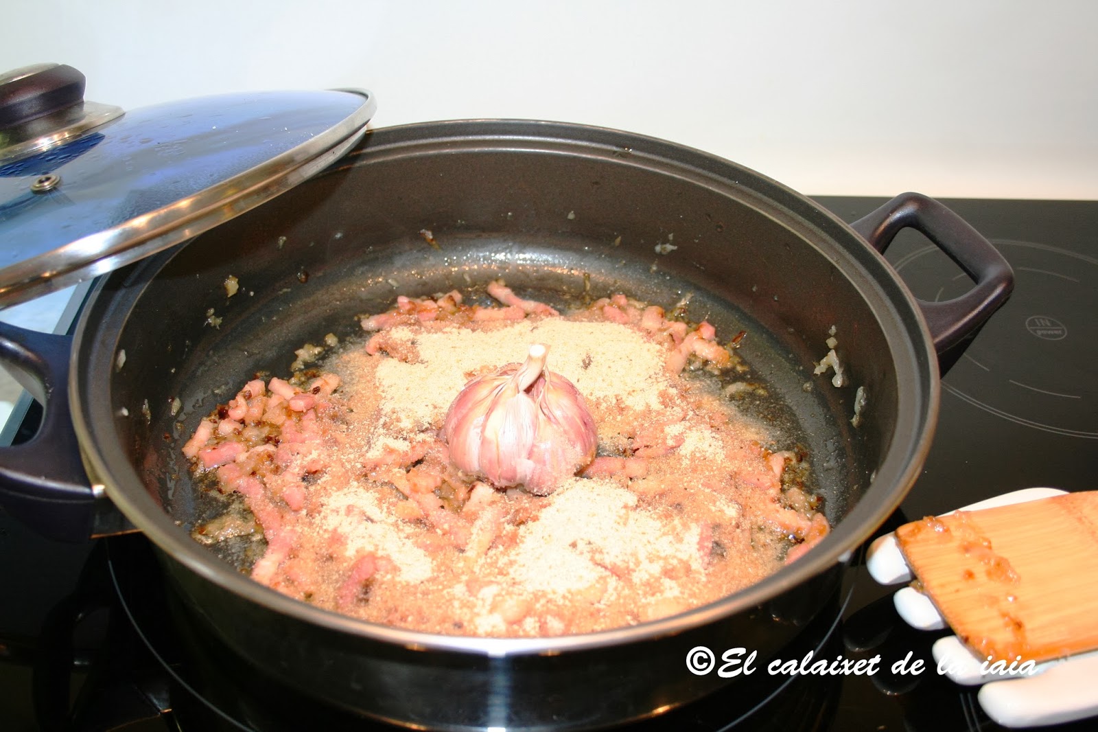 añadimos la cabeza de ajos y la cebolla. Cuando esté pochada, ponemos y las cucharadas soperas de pan, removemos