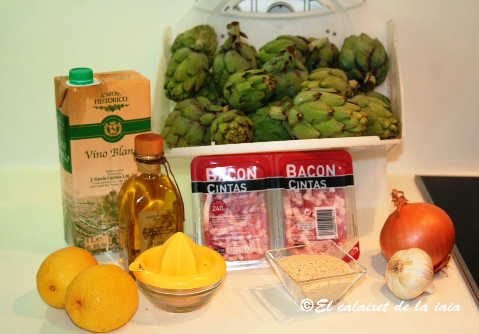 Las cocino de varias maneras, ya que a mi a mi madre le encantaban y hacíamos muchas variantes para su consumo, aunque su receta favorita, era hervidas con agua limón y sal, y aderezadas con un chorrito de vinagre de manzana y unas gotas de aceite de oliva Carbonell, de tapón rojo. En mi casa, no entraba otro aceite, se ponía menos cantidad, pero mi iaia, no quería otro, lo recuerdo incluso, cuando lo compraban en una lata. Hoy os presento una receta de alcachofas guisadas con beicon, porque a mi maridín le encantan así, pero que si cambiamos por jamón serrano serán mas suaves, de todas formas… ricas , ricas