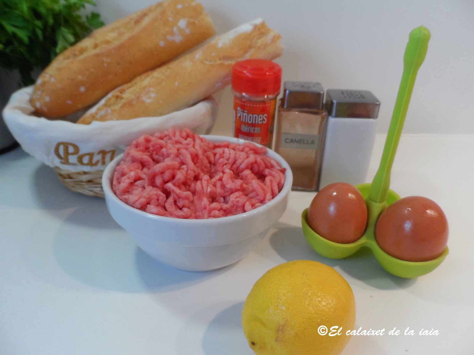 Empezaremos preparando las pelotas, ponemos la carne en un bol (prefiero elegir el trozo de ternera y el de magro, y que lo piquen al momento, a comprar la picada en bandeja, no me sabe igual para nada, mezclamos con una pizquita de canela molida, otra de nuez moscada molida, la ralladura del limón (cuidando que no tenga parte blanca, ya que amarga), los dos huevos enteros, la miga de un trozo de pan remojada en agua, perejil fresco picado, los piñones, un poquito de sal y amasamos bien.