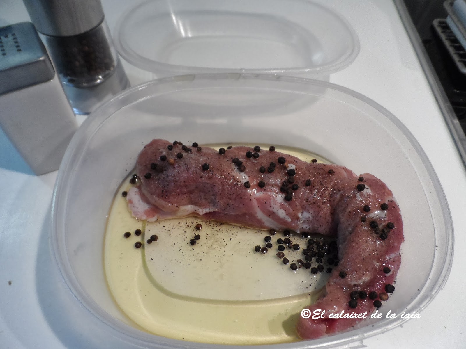 Empezaremos la víspera. y lo primero limpiaremos bien el solomillo de las telillas y los tendoncillos que pueda tener y seguiremos introduciendo el solomillo en un recipiente adecuado para macerarlo con pimienta, sal y Aceite de Oliva Virgen Extra no es necesario que lo cubra ,