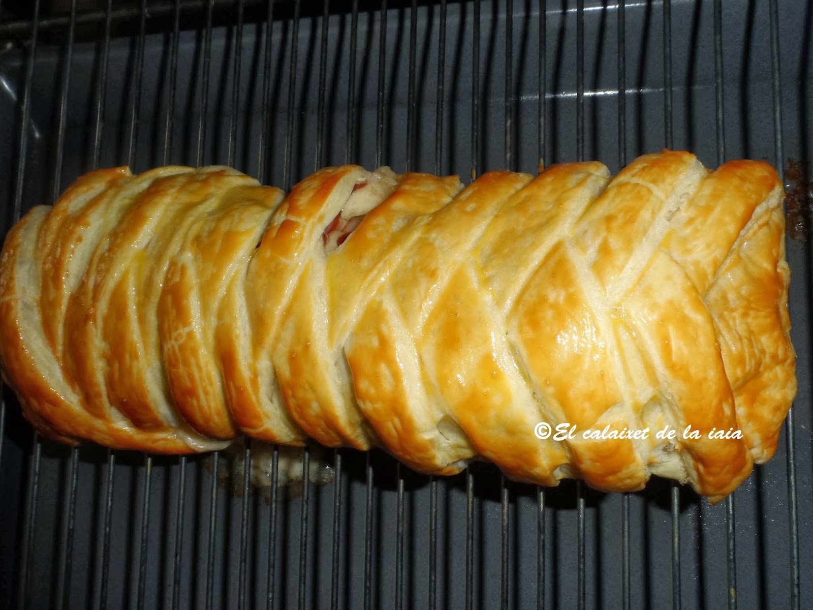 éste es el corte..mmm como hueleeeee. Por miedo a que se quemara el hojaldre, la he dejado poco en el horno, y no se ha llegado a hinchar del todo el hojaldre, aunque está hecho ¿eh? nada crudo (aunque en la imagen si lo parezca un poco) riquísimo, pero mi recomendación si os gusta mas hecho, es que lo dejéis en el horno 10 minutos más, tapándolo con papel de aluminio para que no se queme el hojaldre y suba un poquito mas 😉