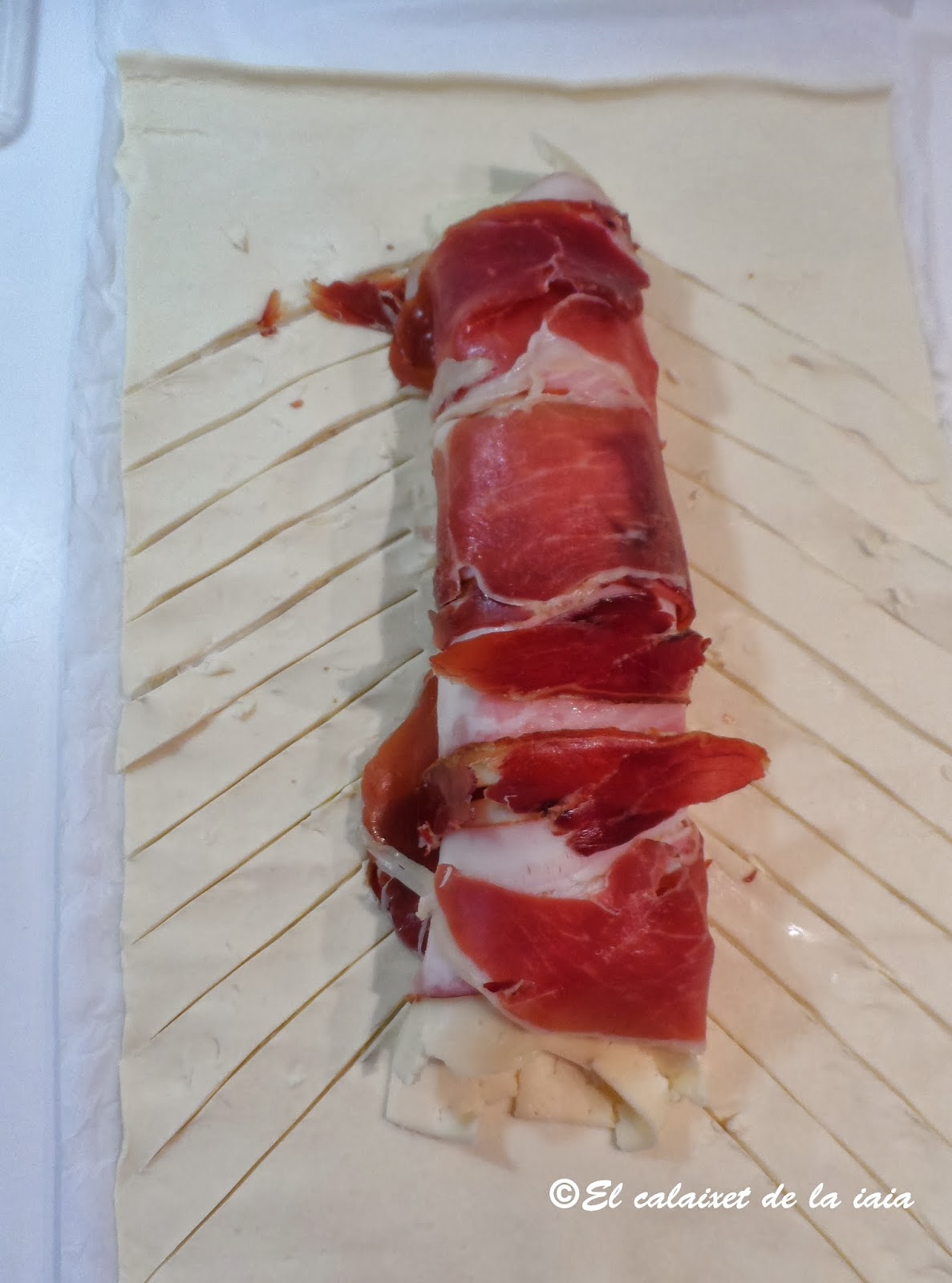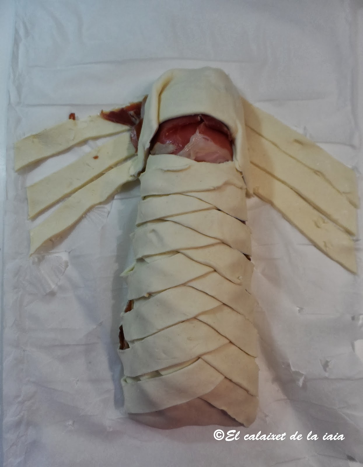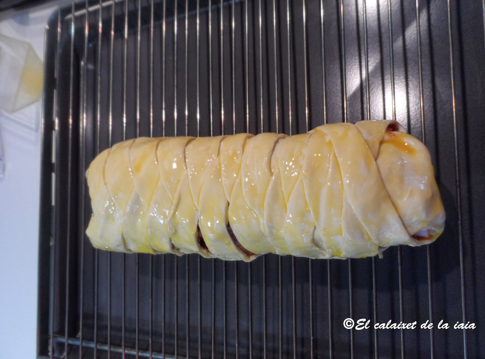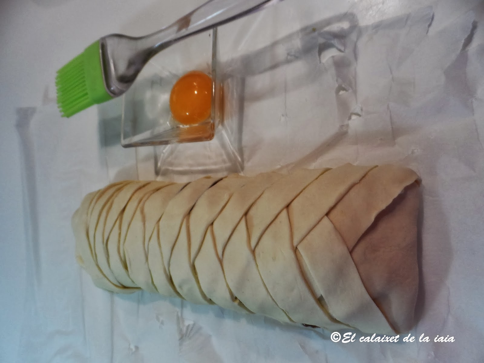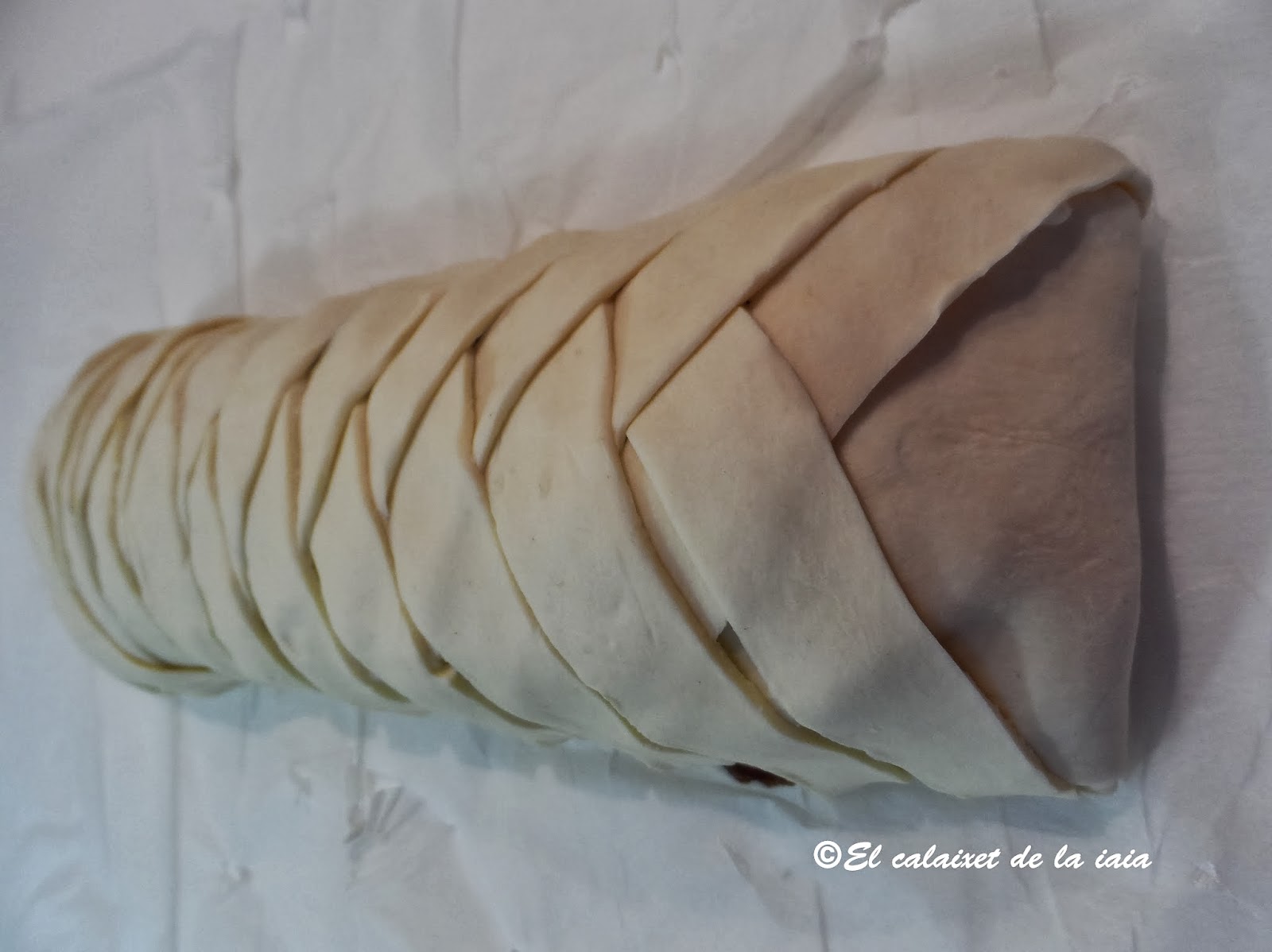 y se envuelve con el hojaldre, con un cuchillo afilado o corta pizzas, haremos unos cortes de unos dos cm.
