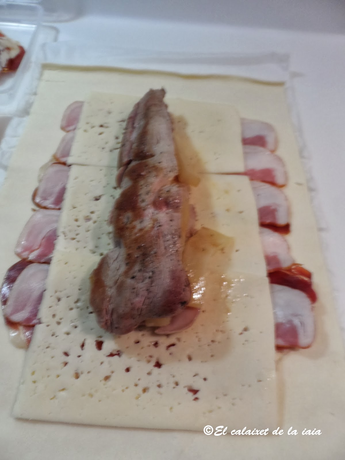 Una vez que se han colocado las capas de jamón y queso, se coloca el solomillo encima bien centrado .