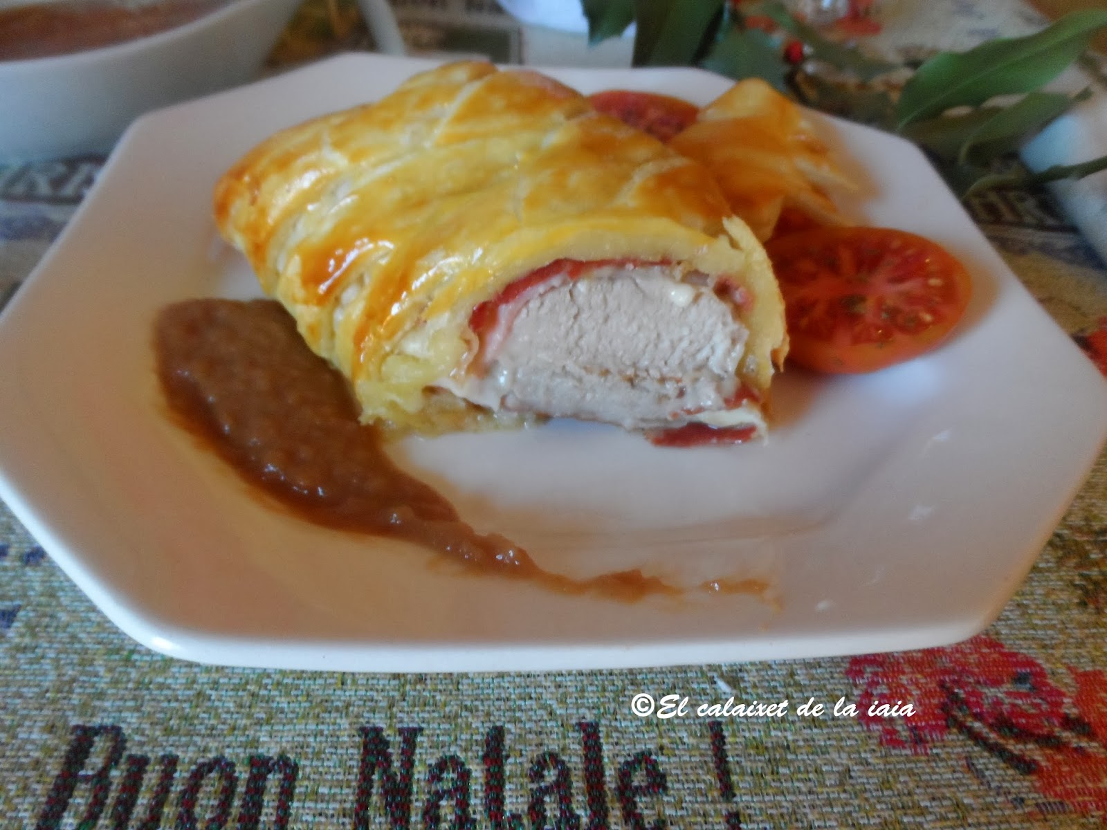 Una idea de un plato de Nochebuena, Navidad, …o cualquier día es el solomillo al hojaldre con jamón y queso, acompañado de una reducción de Oporto y cebolla pochada.