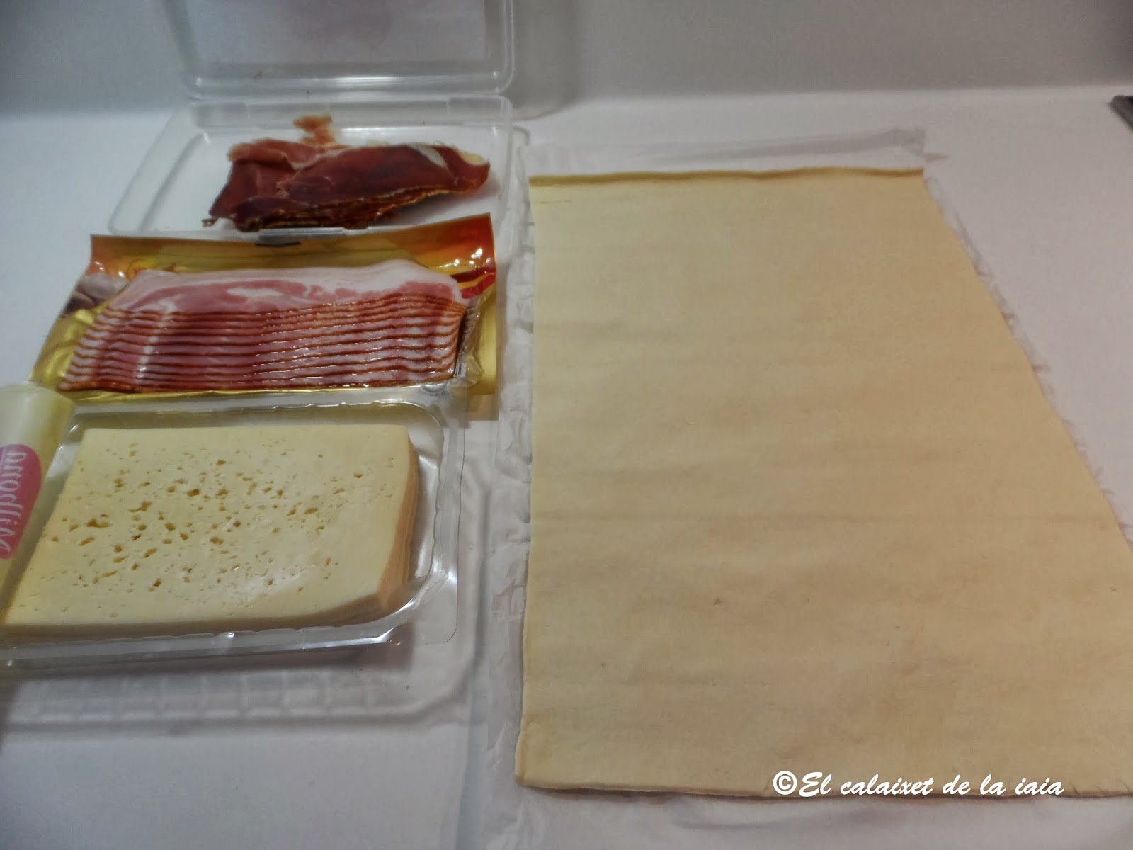 Extender la plancha de hojaldre y colocar una capa de beicon, serrano o y otra encima de queso hawartí, esto según el gusto de cada uno.