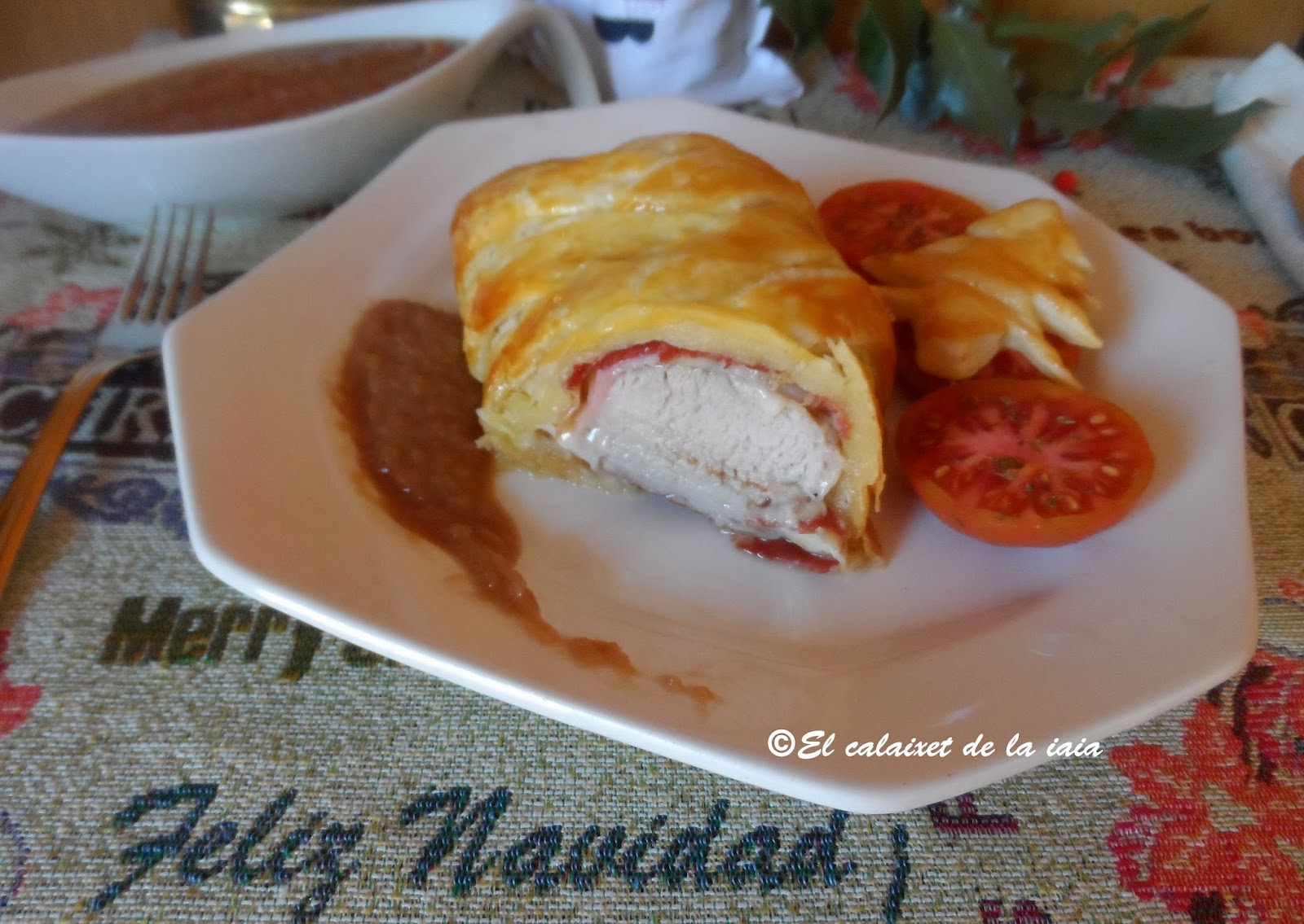 presentar el hojaldre en el plato pintar con un poco de salsa, y el resto de salsa,en una salsera para que cada cual se sirva a su gusto