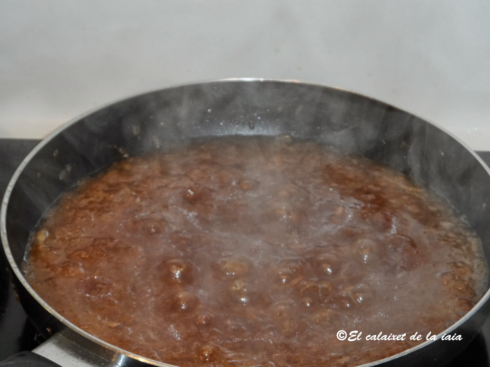 una vez pochada, la cebolla se le añade el vaso de vino de Oporto y dejamos que reduzca hasta la mitad o a 1/3 del volumen original.