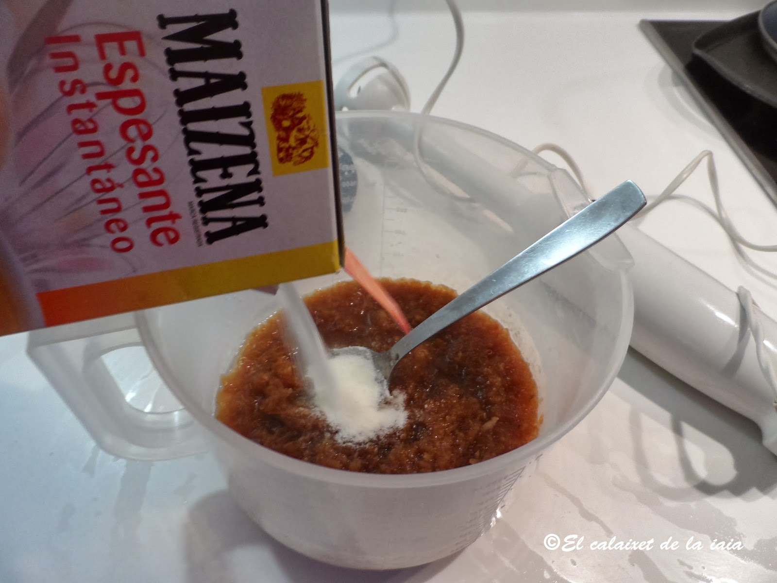 Una vez reducido el vino, se añade una cucharada (si os gusta la salsa mas o menos espesa añadir o reducir cantidad) de Maicena espesante que en caliente no forma grumos