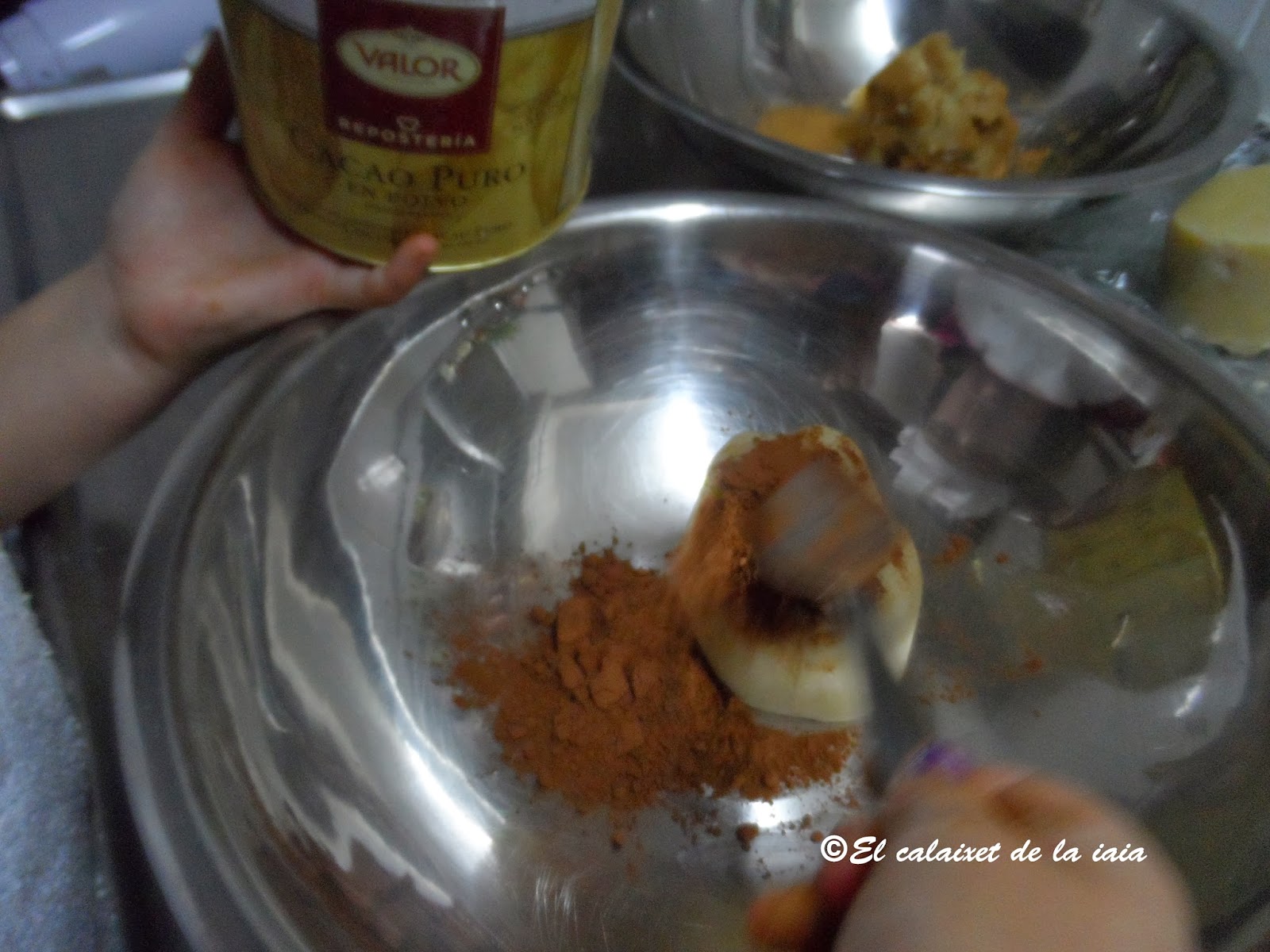 en otro bol ponemos otra bola de mazapán y dos cucharadas de cacao puro sin azúcar en polvo