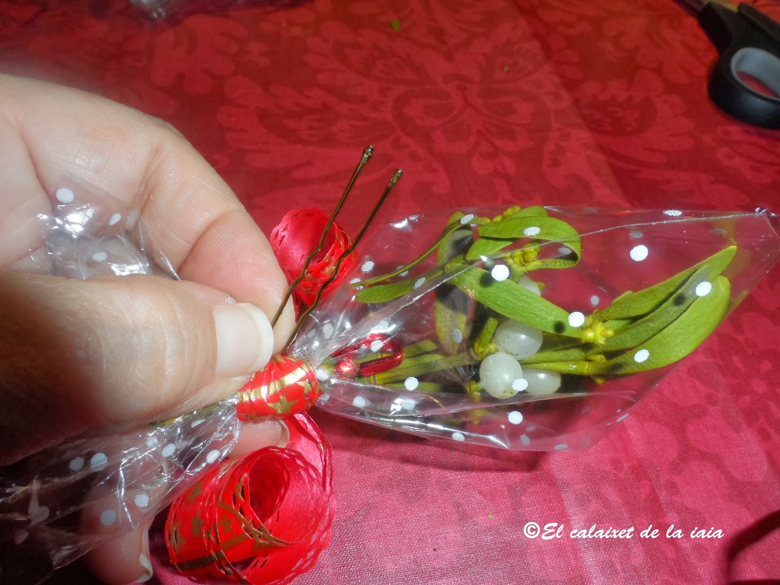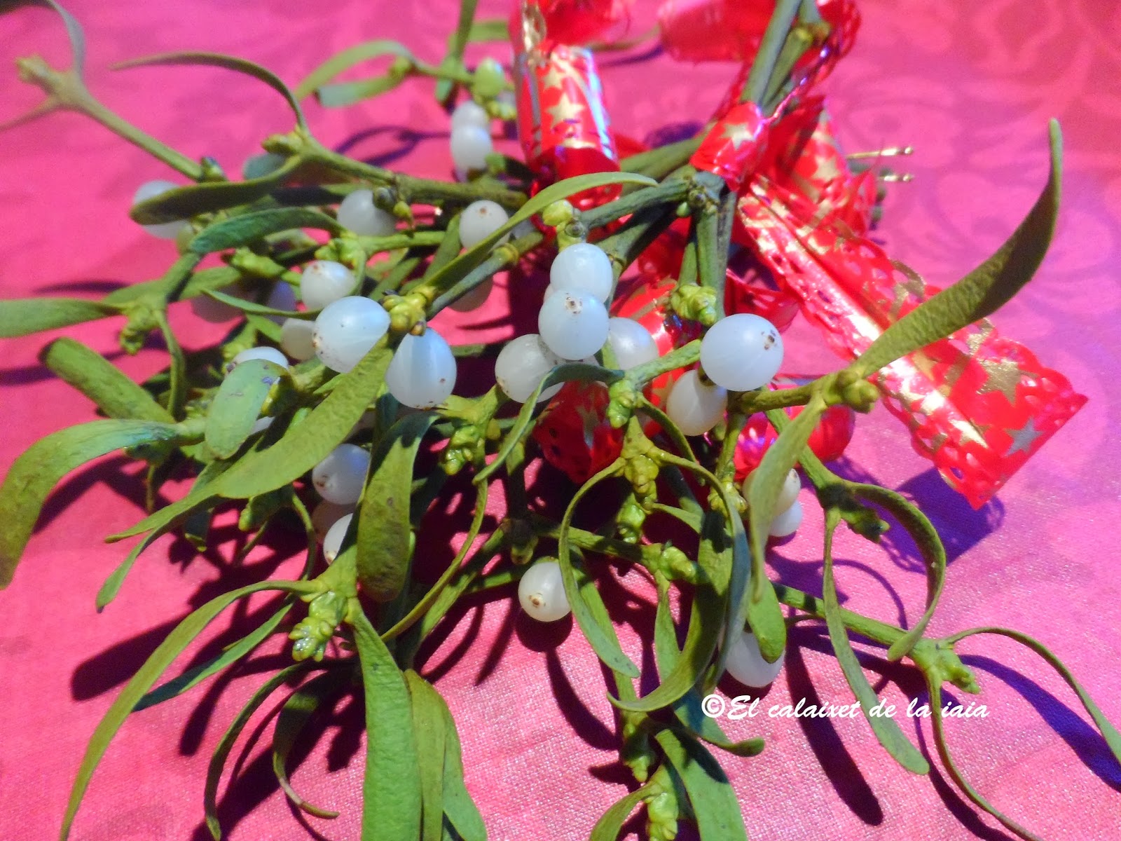 En algunas zonas de España está prohibida su recolección, porque sirve de alimento para los pájaros y en otras si, porque se come a los pinos….en fin que mejor para asegurarnos, comprarlo en la floristería. Con una rama mediana me sale para la familia y los mas íntimos, mis cuñadas lo quieren siempre en la mínima expresión y a mi no me gusta tener un bolsón enorme todo el año arriba de la puerta, sino algo mas discreto…si ha de hacer…hace igual.