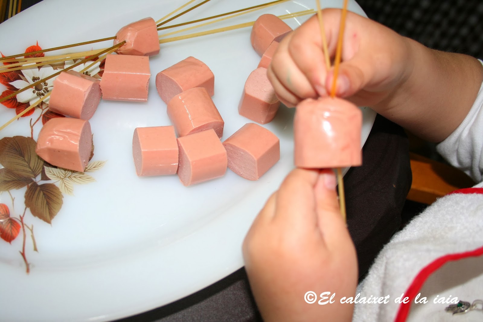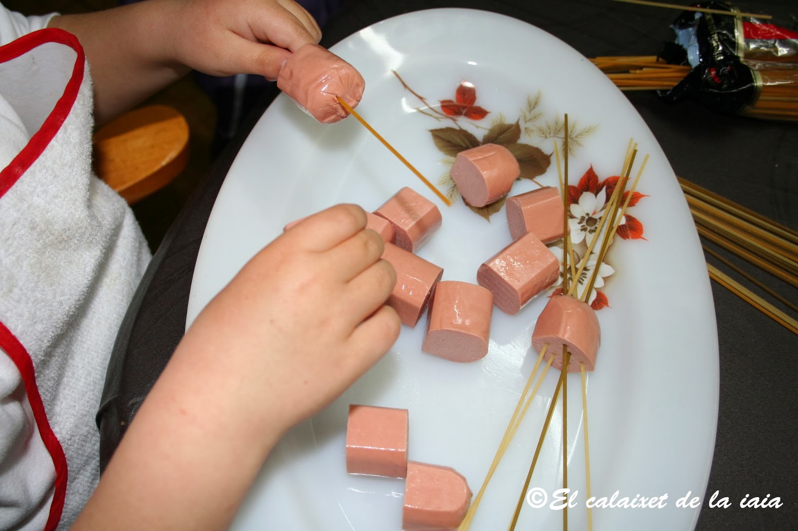 y los dejamos dentro del trozo de salchicha hacia la mitad mas o menos