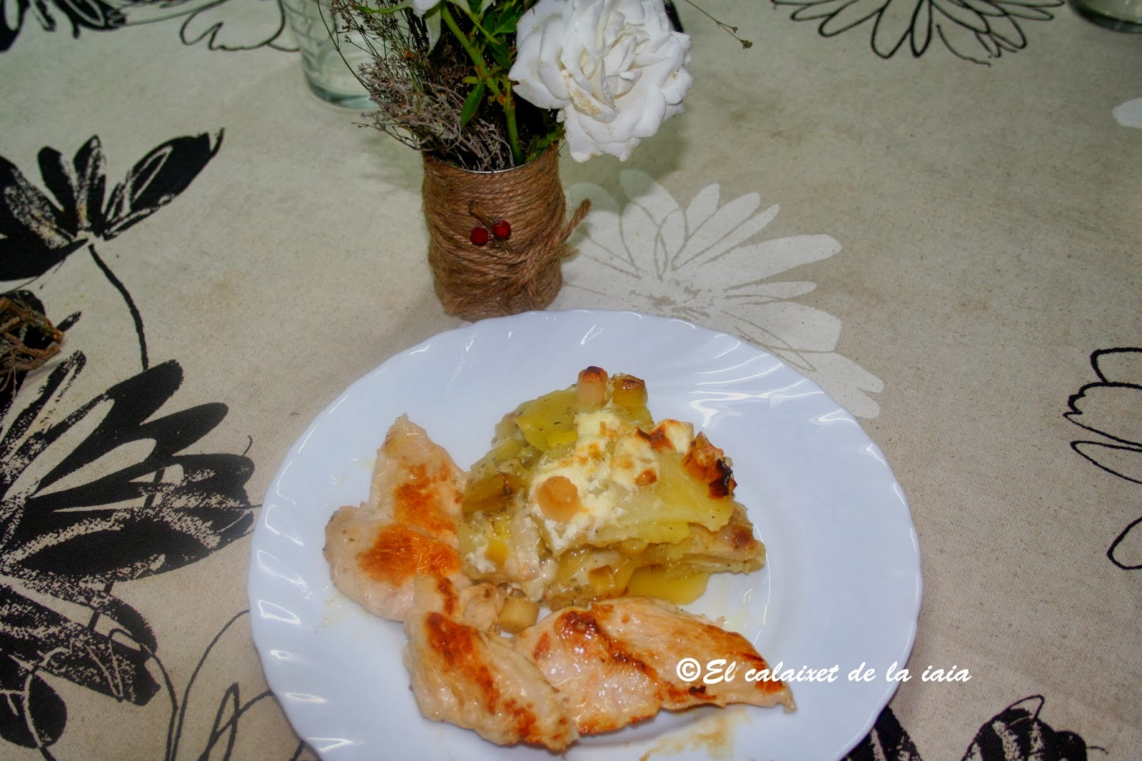 Si tengo prisa, paso las rodajas de patatas por el microondas, después de untarlas un poco en aceite durante 8 minutos a 800 w, con lo cual es suficiente tenerlo en el horno una hora. A los 45 min. quito el papel de aluminio y gratino 15 minutos .