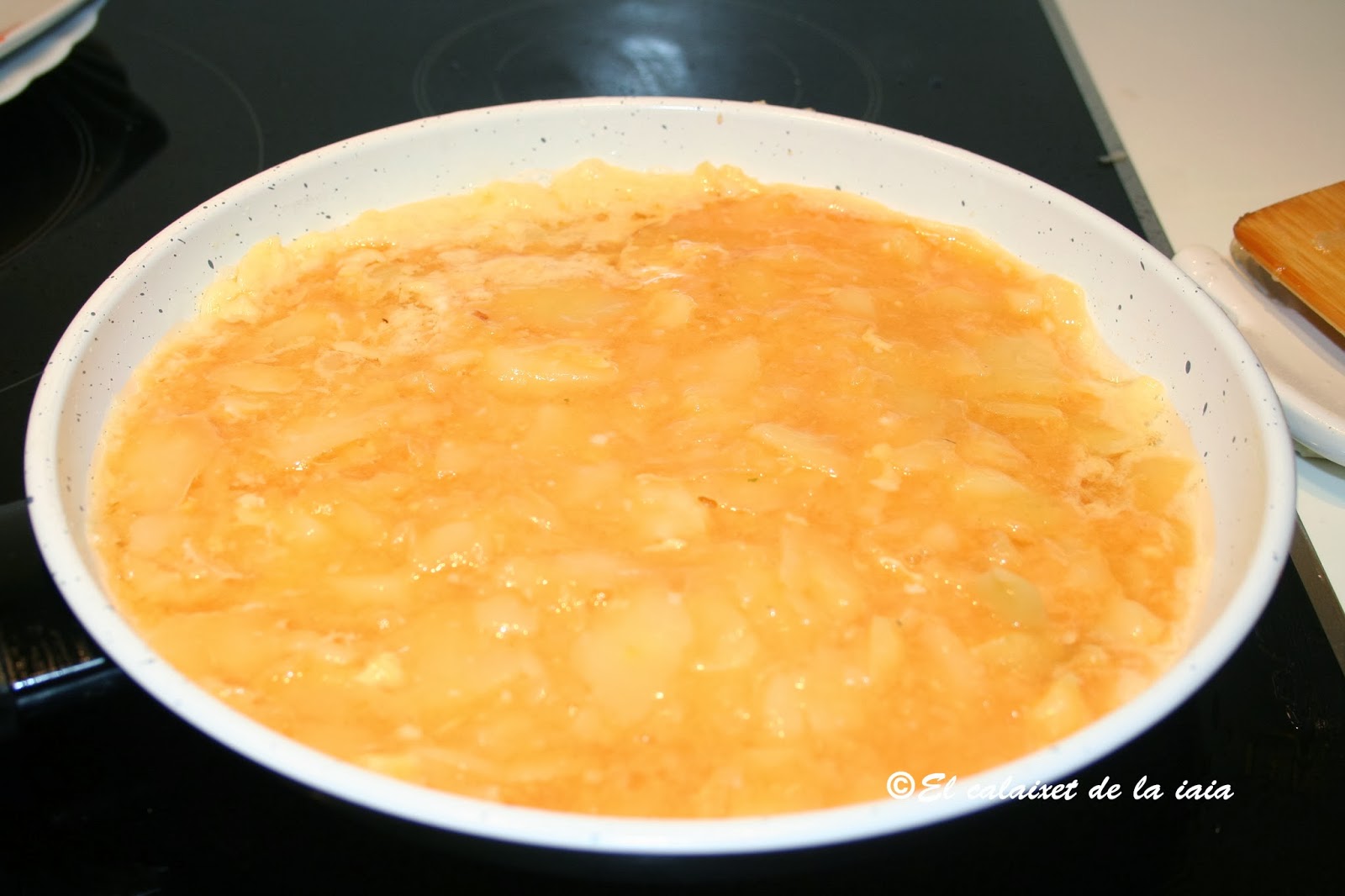 El punto de cuajado del huevo… va siempre a gusto del consumidor, al igual que poner o no cebolla. En casa nos gusta con cebolla y el huevo poco cuajado, aunque hoy, protestarán porque con la cosa de hacer las fotos, se me ha cuajado demasiado, pero no pasa nada, por un día.
