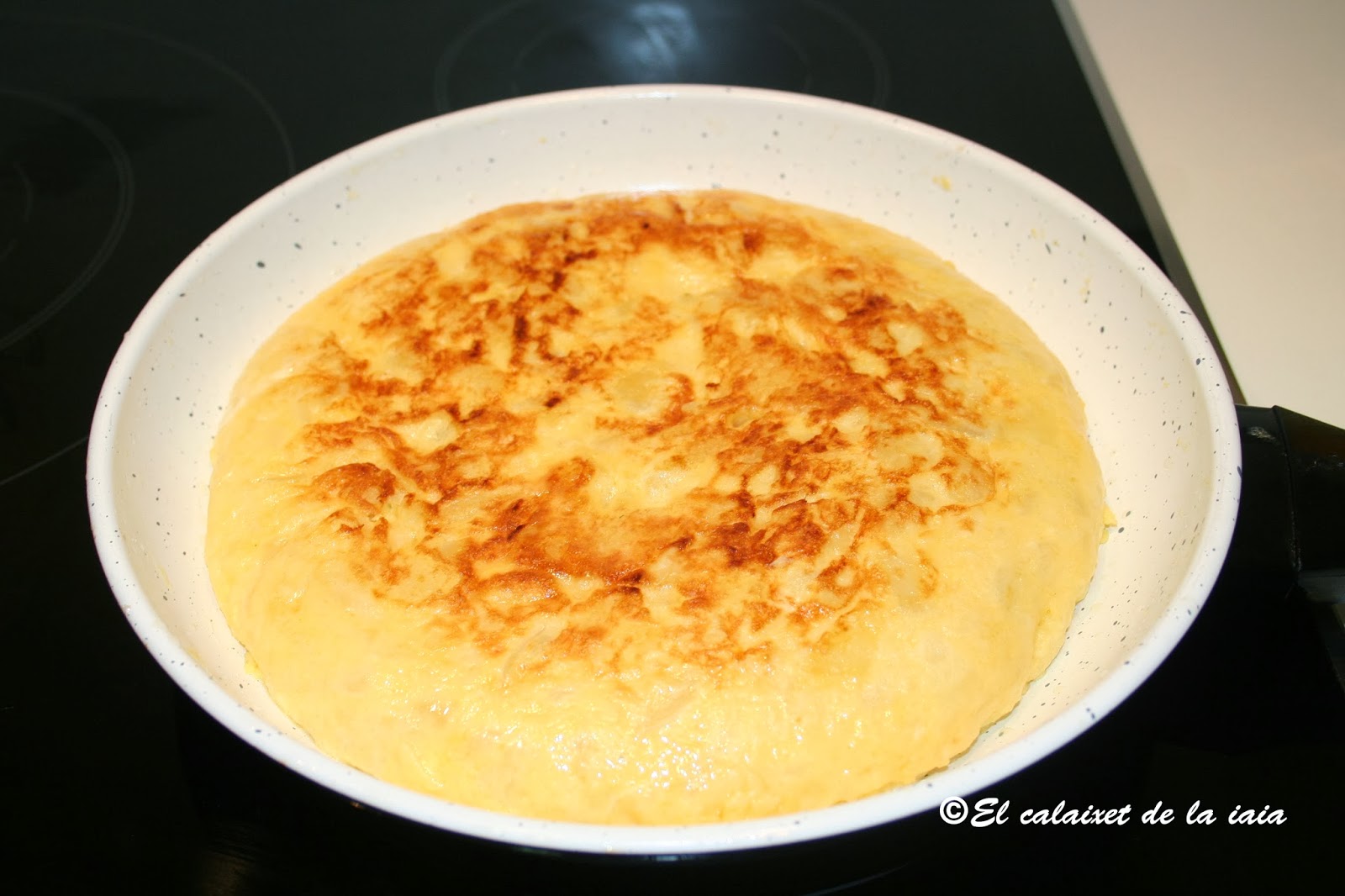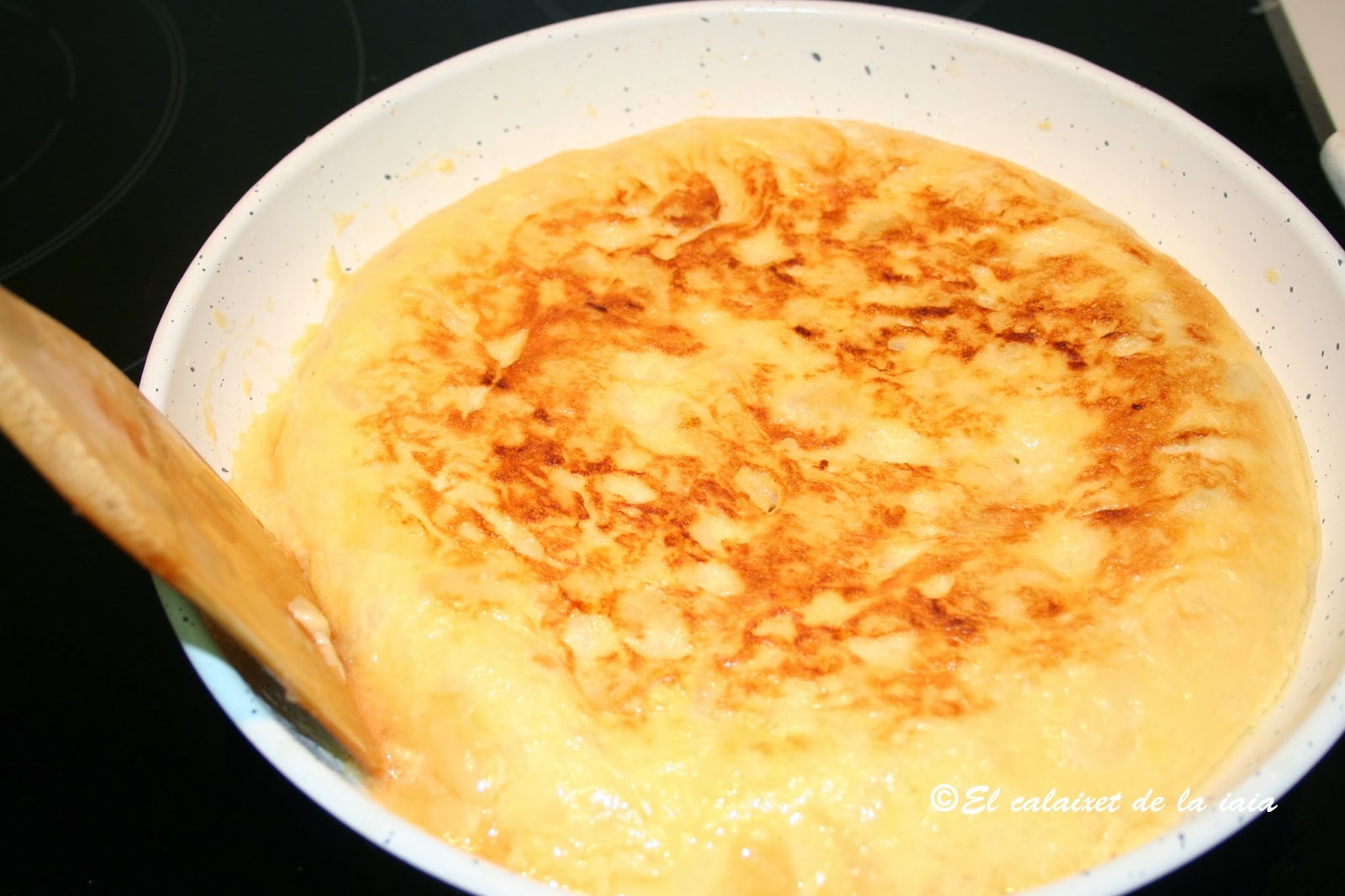 y le daremos la vuelta con un plato o vuelcatortillas con mucho cuidado de no quemarnos.