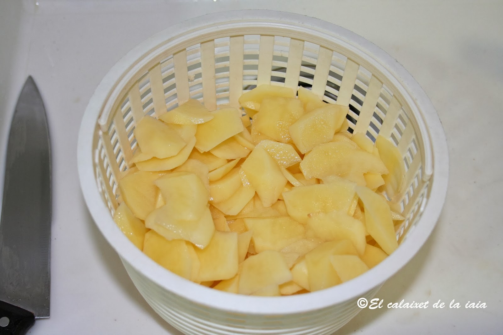 Pelamos y troceamos las patatas y lavamos bien para quitarles el almidón, dejamos escurrir