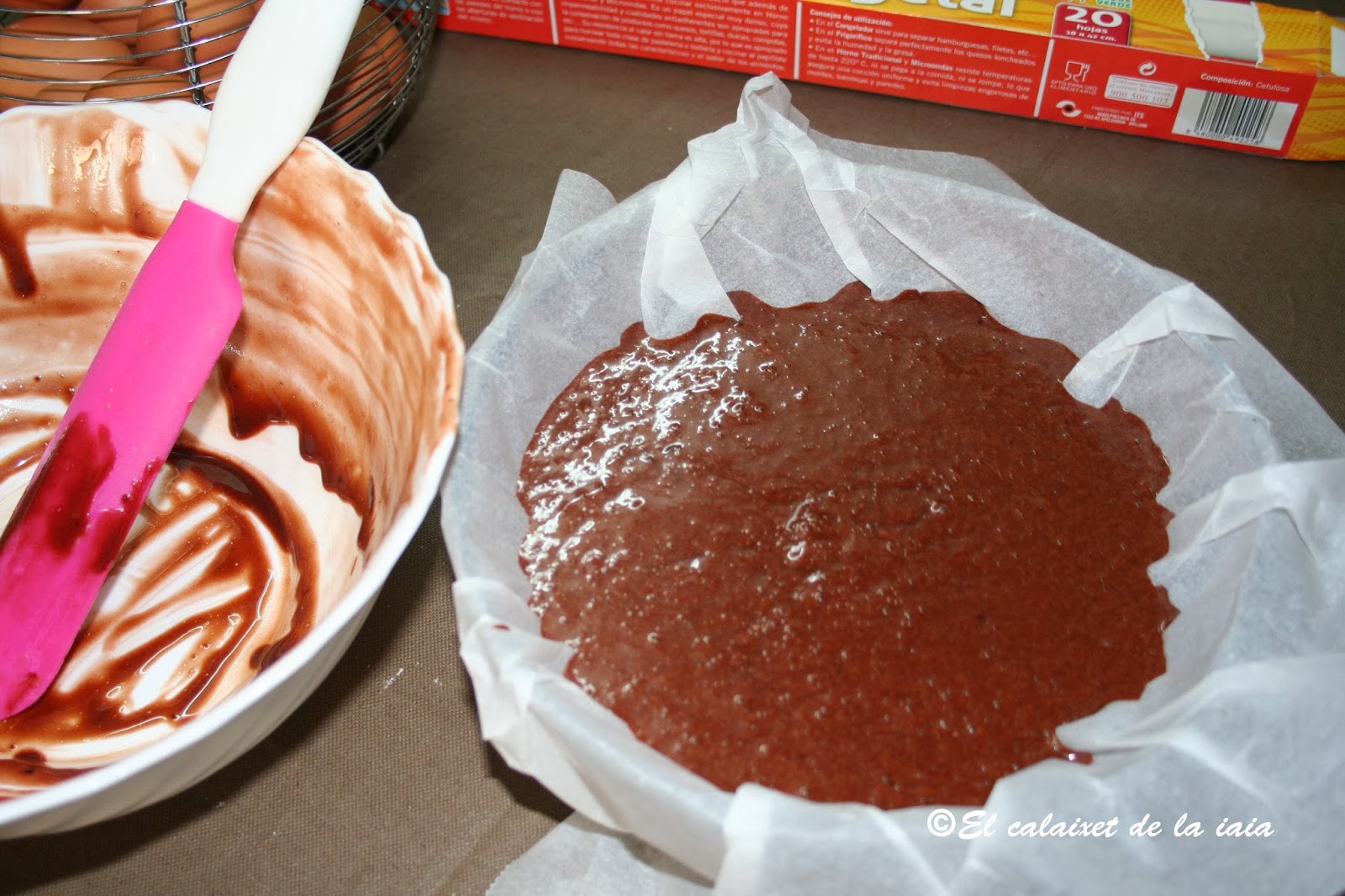 y volcamos la masa. Tened en cuenta que sube mucho en el microondas por lo que ha de ser un molde con bastante profundidad para evitar que se salga al subir.