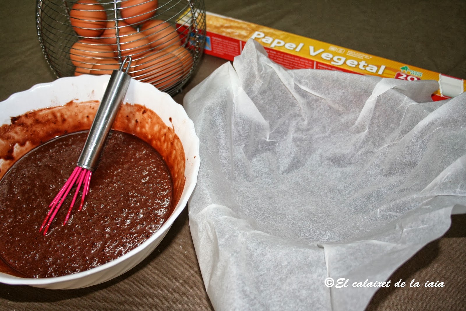 preparamos un molde ó un bol apto para microondas y ponemos papel vegetal