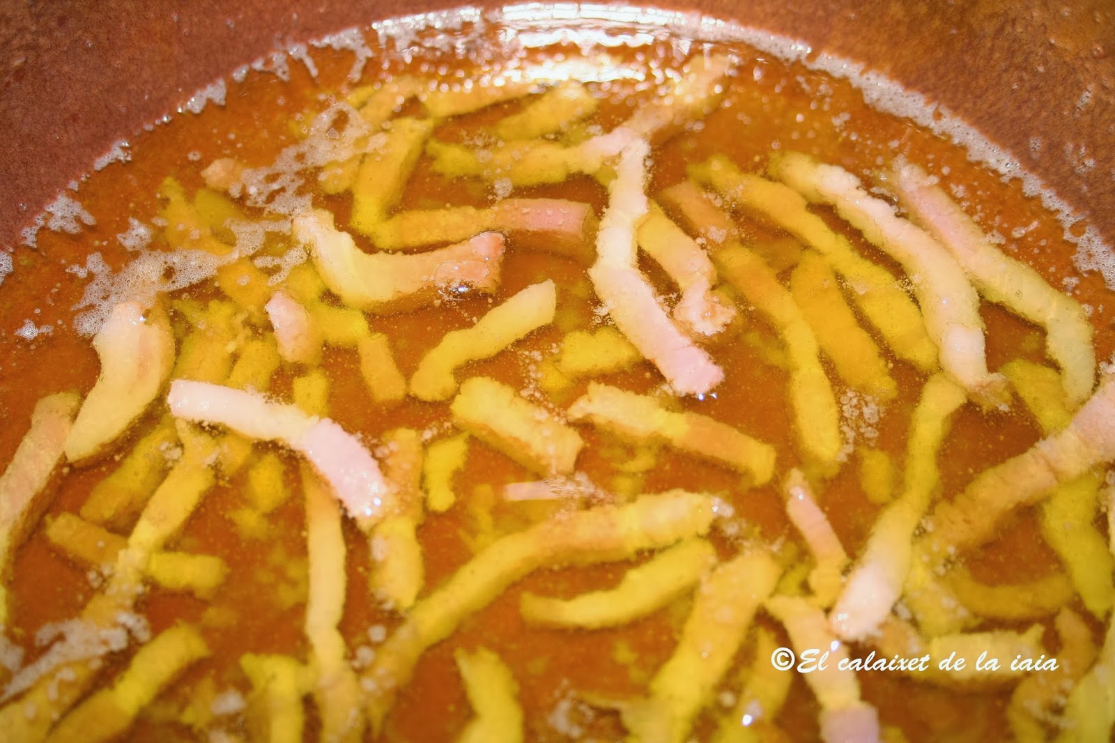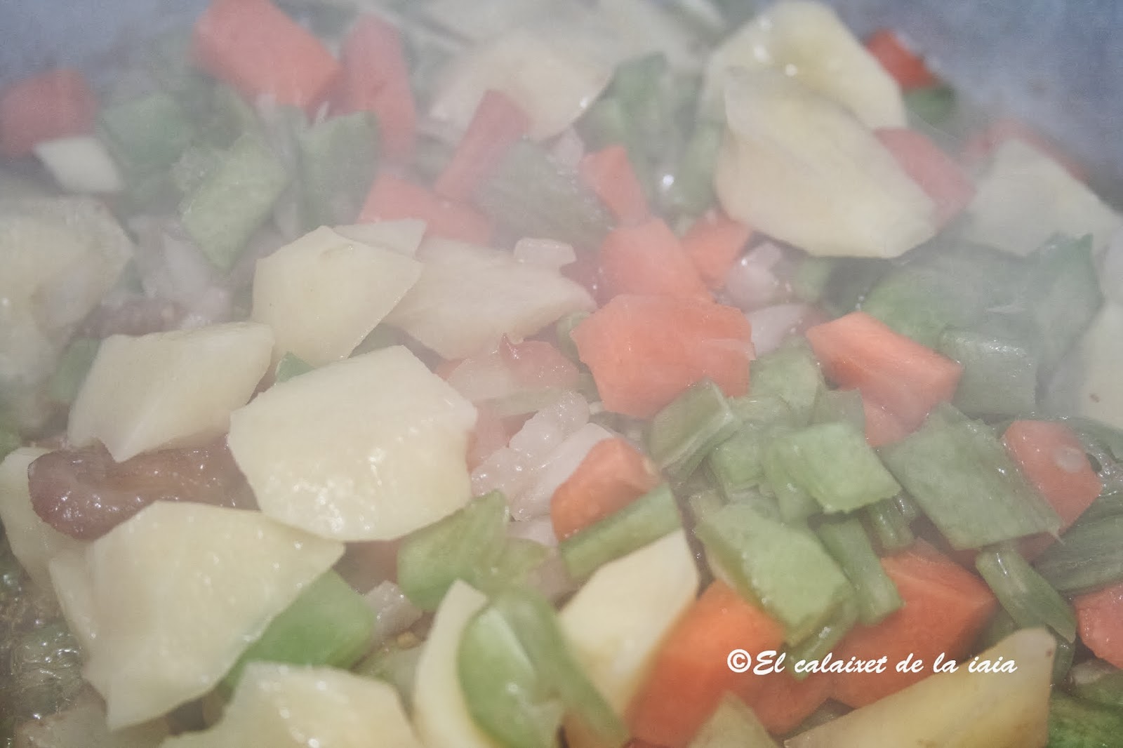 Una vez doradas las tiras de jamones, añadimos las verduras y freimos ligeramente