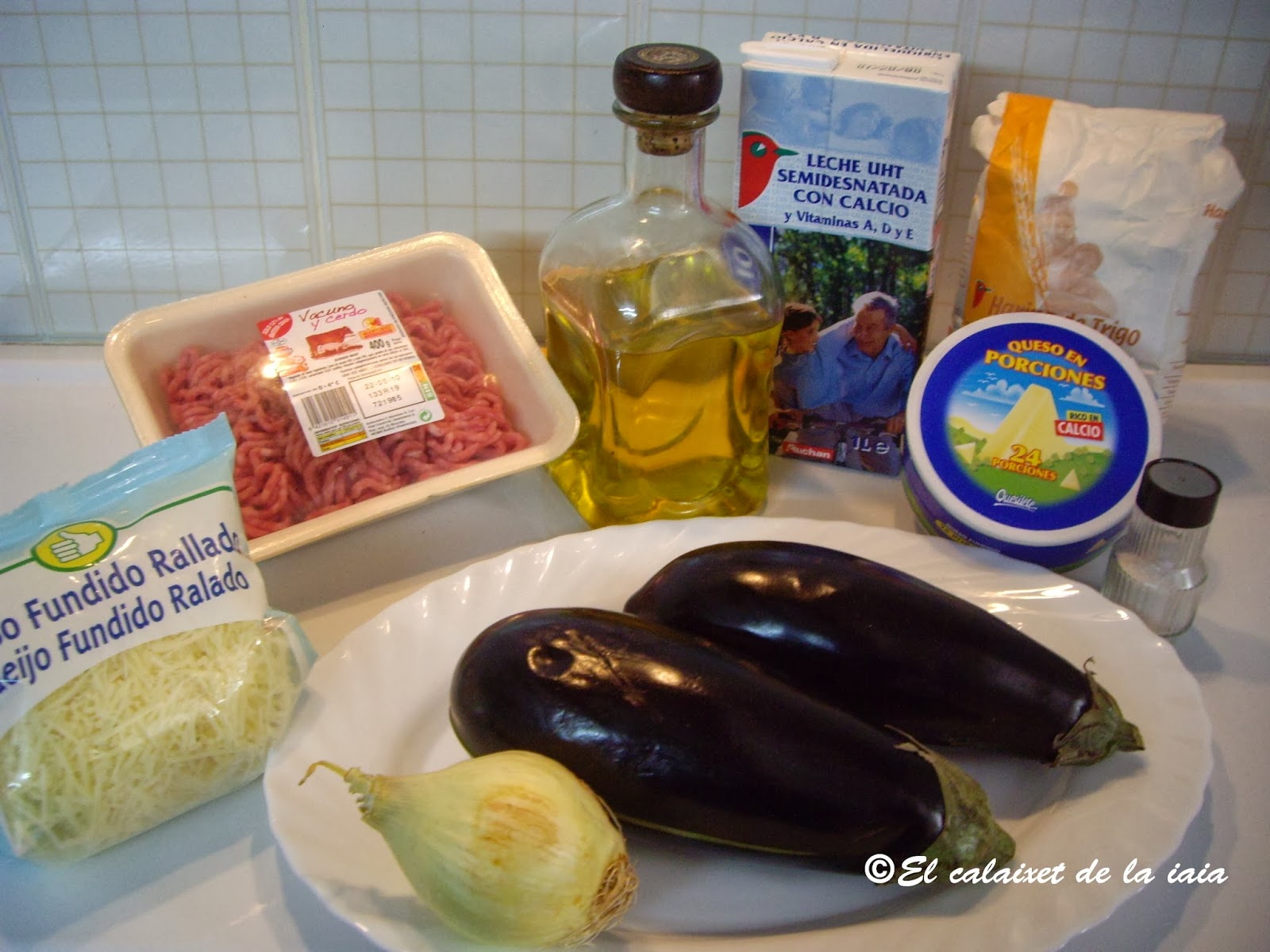En una sartén pongo en aceite la cebolla rallada a pochar. En cuanto está lista agrego dos cucharadas soperas de harina para que se dore un poco a fuego lento, éste paso es IMPRESCINDIBLE, pues de lo contrario la harina sabe a cruda y altera el gusto de la bechamel. Una vez dorada la harina voy añadiendo lentamente la leche, sin dejar de remover para evitar grumos y que se pegue. Ha de quedar una bechamel mas bien compacta. Cuando se despega de la sartén añado 4 quesitos en porciones y nuez moscada.