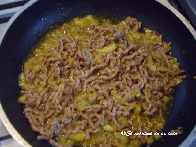 Y los pongo a freír en aceite junto a la carne al fuego lento. Sal y pimienta y reservo.