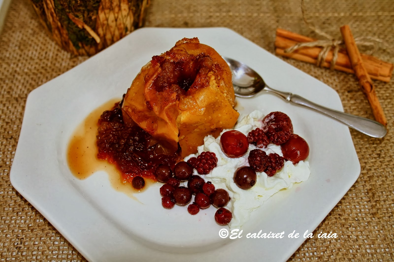 Y para asar una manzana entera, una de las maneras más sencillas y deliciosas de comer manzana, lo mejor es descorazonarla, rellenarla con un poco de azúcar o miel ,un poco de canela, opcionalmente un chorrito de mistela y acompañarla por ejemplo con unas frutas del bosque, ó unos frutos secos. Para evitar que revienten durante el horneado es recomendable practicar una incisión ligera a lo largo de su circunferencia. Cuando los jugos burbujeen y nos embriague su dulce olor, estarán a punto para disfrutar de esta reina del otoño.