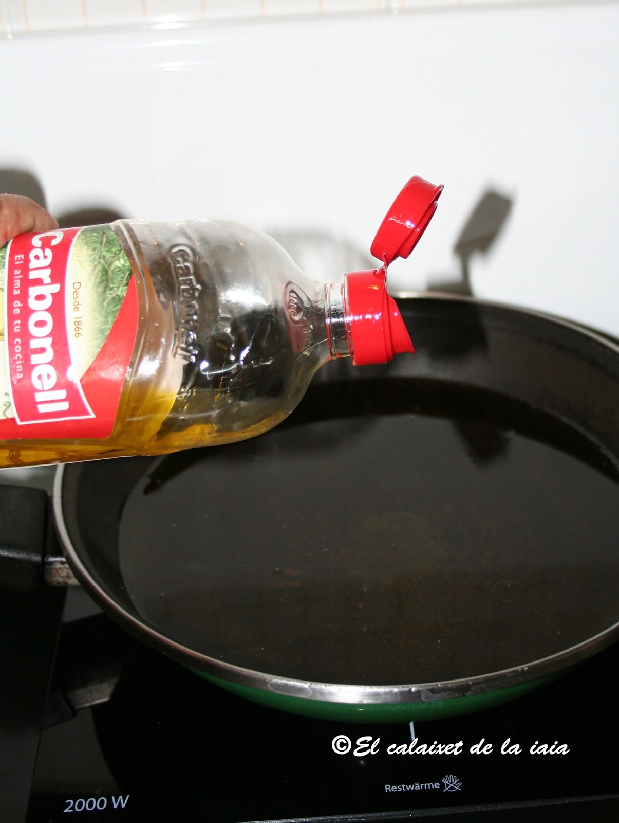 las acompañaremos con unas patatas fritas, cortadas en gajos (gallóns) y un poco de all i oli de mortero que ha hecho hoy mi hijo mayor y os aseguro que es un auténtico maestro haciéndolo