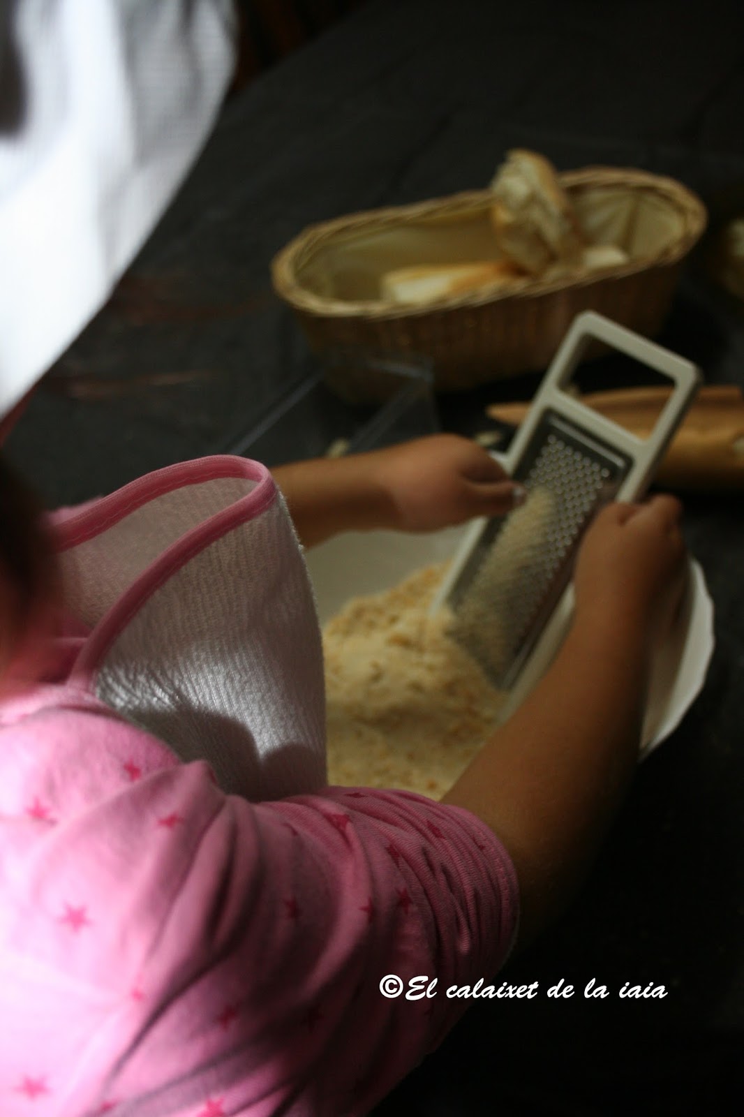 Milagro es que no se ha rallado los deditos, casi hay mas pan fuera del cuenco que dentro, pero está perfectamente rallado, es una artista mi chica, ahora reservamos