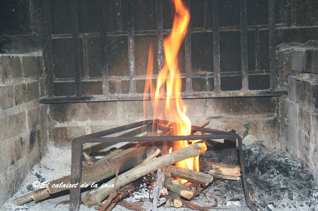 Colocamos las trébedes (en valenciano tres pèus) y encendemos el fuego con un trozo de tea, el experto en fuego, siempre es mi chico, mi maridín es quien busca la leña, y se ocupa siempre del fuego 😉