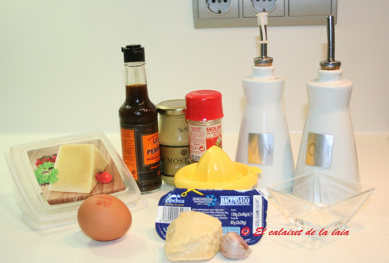 Siempre suelo tener en el frigo una botellita de salsa César, si somos dos, no me sale cuenta hacerla. Pero si somos mas la hago yo en casa, aunque el queso parmesano es caro, solo utilizamos 50 gr. por lo que la salsa sale muchísimo mas económica que la comprada.