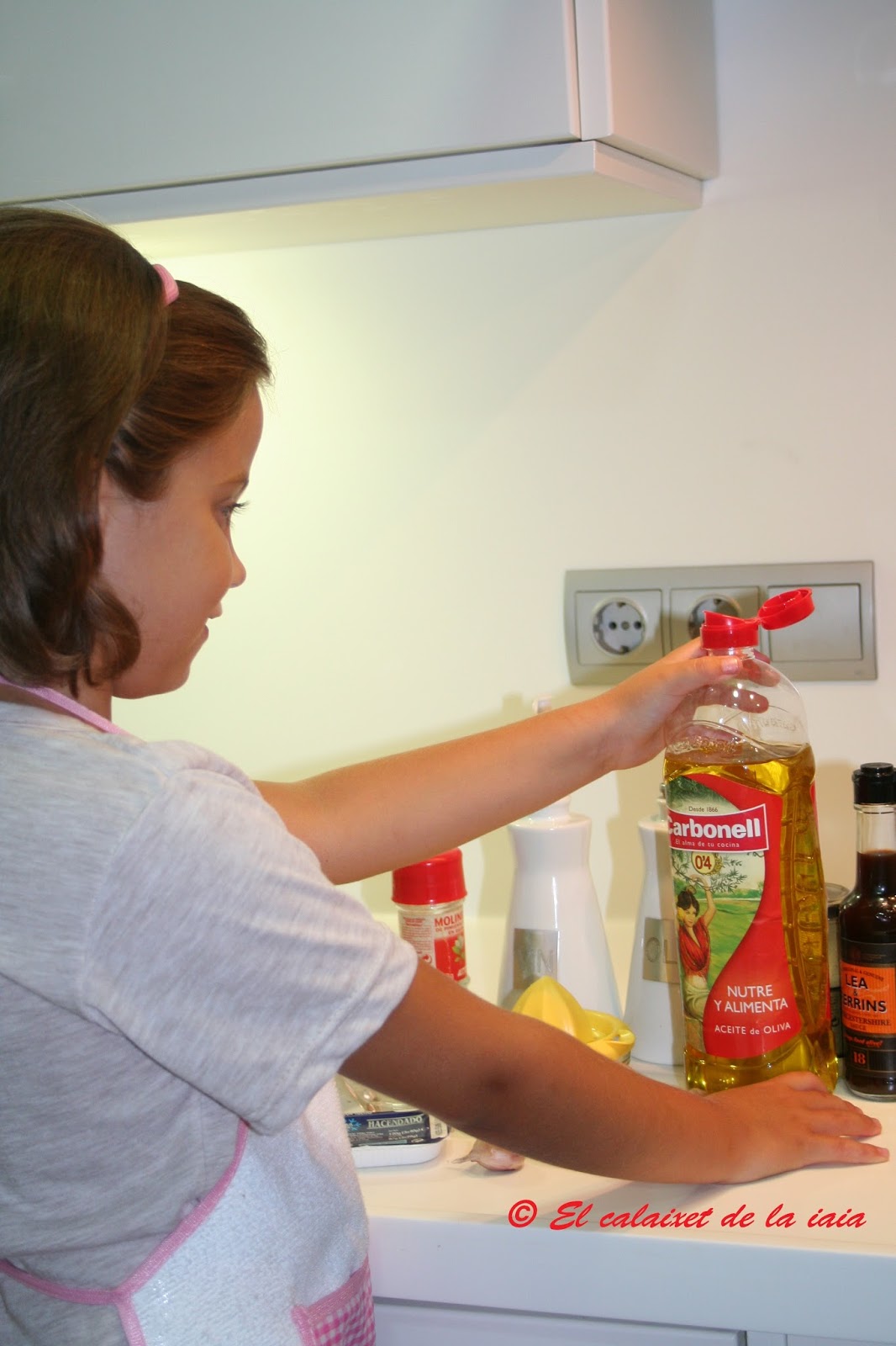 Hoy tengo pinche de lujo, mi princesita hará la salsa. Es una cocinillas y en cuanto llega a casa, se pone el delantal. Siempre que cocino platos sin peligro… es ella quién los hace siguiendo mis instrucciones, a ella le encanta, y yo disfruto enseñándole, seguro que algo quedará en su cabecita para el día de mañana.