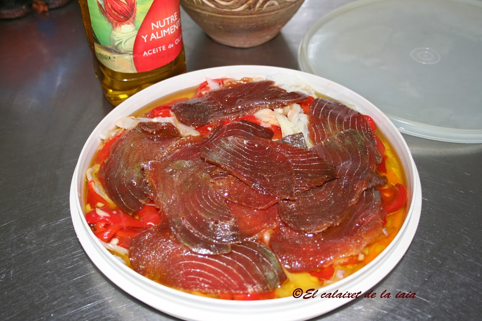 La «moixama» (mojama en castellano), es una parte noble del atún. Se trata de una pieza de forma rectangular, que se encuentra cerca del lomo blanco. En algunas pescaderías se la llama simplemente «tronco de atún». La moixama es una forma de preparación del atún que solo se usa en la costa mediterránea. Mojama proviene del nombre árabe musama, quienes curaban el atún cubierto de sal al oreo, al sol, con el fin de conservar un preciado alimento. La mojama se puede hacer con cualquier tipo de atún o bonito, incluso con caballa u otros pescados, pero la moixama más apreciada es la que se elabora con atún rojo. Su precio es alto, por lo que suelo comprarla cuando está de oferta, la corto en láminas finas, y la conservo en tarro de cristal cubierta por completo con aceite de oliva.
